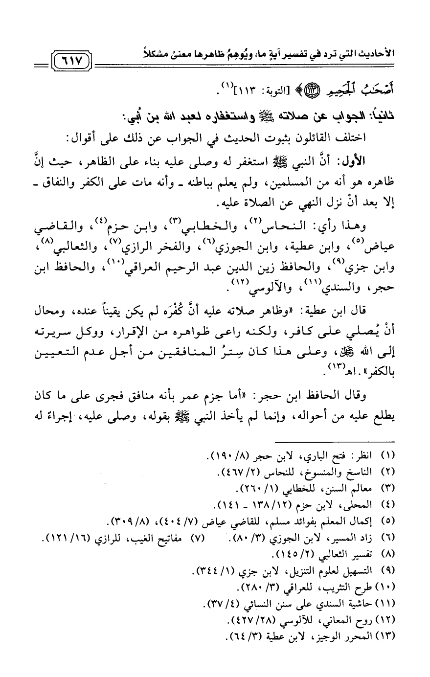 قال ابن عطية: «وظاهر صلاته عليه أنَّ كُفْرَه لم يكن يقيناً عنده، ومحال أنْ يُصلي على كافر، ولكنه راعى ظواهره من الإقرار، ووكل سريرته إلى الله عز وجل، وعلى هذا كان سِترُ المنافقين من أجل عدم التعيين بالكفر». اهـ (¬13)