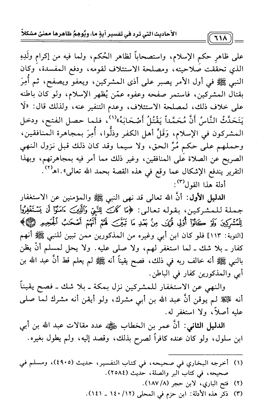 الدليل الأول: أنَّ الله تعالى قد نهى النبي - صلى الله عليه وسلم - والمؤمنين عن الاستغفار جملة للمشركين، بقوله تعالى: (مَا كَانَ لِلنَّبِيِّ وَالَّذِينَ آمَنُواْ أَن يَسْتَغْفِرُواْ لِلْمُشْرِكِينَ وَلَوْ كَانُواْ أُوْلِي قُرْبَى مِن بَعْدِ مَا تَبَيَّنَ لَهُمْ أَنَّهُمْ أَصْحَابُ الْجَحِيمِ (113)) [التوبة: 113] فلو كان ابن أبي وغيره من المذكورين ممن تبين للنبي - صلى الله عليه وسلم - أنهم كفار - بلا شك - لما استغفر لهم، ولا صلى عليه. ولا يحل لمسلم أنْ يظن بالنبي - صلى الله عليه وسلم - أنه خالف ربه في ذلك، فصح يقيناً أنه - صلى الله عليه وسلم - لم يعلم قط أنَّ عبد الله بن أبي والمذكورين كفار في الباطن.