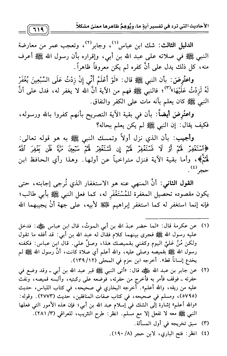 الدليل الثالث: شك ابن عباس (¬1)، وجابر (¬2)، وتعجب عمر من معارضة النبي - صلى الله عليه وسلم - في صلاته على عبد الله بن أبي، وإقراره بأن رسول الله - صلى الله عليه وسلم - أعرف منه، كل ذلك يدل على أنَّ كفره لم يكن معروفاً ظاهراً.