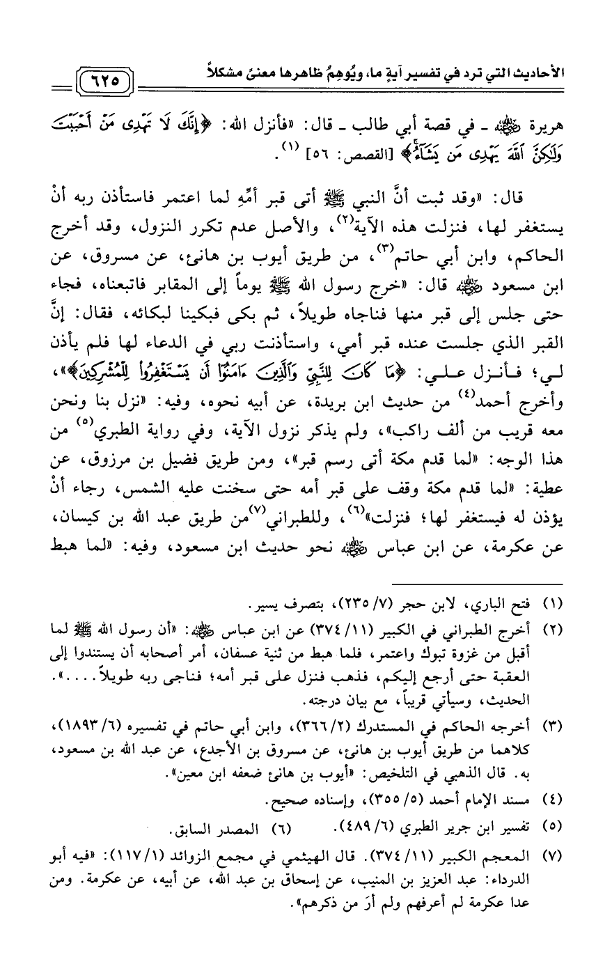 (¬2) أخرج الطبراني في الكبير (11/ 374) عن ابن عباس - رضي الله عنه -: «أن رسول الله - صلى الله عليه وسلم - لما أقبل من غزوة تبوك واعتمر، فلما هبط من ثنية عسفان، أمر أصحابه أن يستندوا إلى العقبة حتى أرجع إليكم، فذهب فنزل على قبر أمه؛ فناجى ربه طويلاً .... ». الحديث، وسيأتي قريباً، مع بيان درجته.