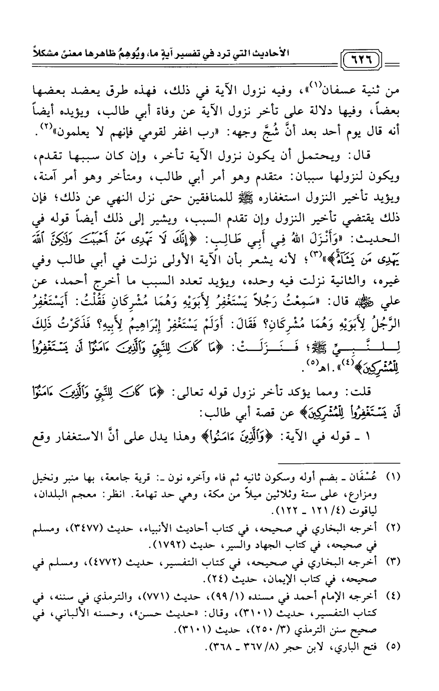 من ثنية عسفان (¬1)»، وفيه نزول الآية في ذلك، فهذه طرق يعضد بعضها بعضاً، وفيها دلالة على تأخر نزول الآية عن وفاة أبي طالب، ويؤيده أيضاً أنه قال يوم أحد بعد أنَّ شُجَّ وجهه: «رب اغفر لقومي فإنهم لا يعلمون». (¬2)