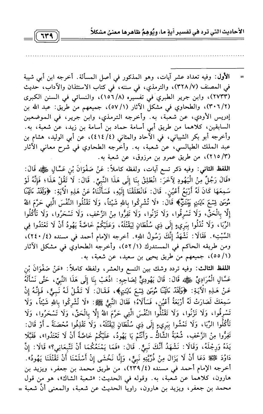 اللفظ الثالث: وفيه تردد وشك بين التسع والعشر، ولفظه كاملاً: «عَنْ صَفْوَانَ بْنِ عَسَّالٍ الْمُرَادِيِّ - رضي الله عنه - قَالَ: قَالَ يَهُودِيٌّ لِصَاحِبِهِ: اذْهَبْ بِنَا إِلَى هَذَا النَّبِيِّ، حَتَّى نَسْأَلَهُ عَنْ هَذِهِ الْآيَةِ: (وَلَقَدْ آتَيْنَا مُوسَى تِسْعَ آيَاتٍ) (ہ ھ ھ ھ ھ ے)، فَقَالَ: لَا تَقُلْ لَهُ نَبِيٌّ، فَإِنَّهُ إِنْ سَمِعَكَ لَصَارَتْ لَهُ أَرْبَعَةُ أَعْيُنٍ، فَسَأَلَاهُ؛ فَقَالَ النَّبِيُّ - صلى الله عليه وسلم -: «لَا تُشْرِكُوا بِاللَّهِ شَيْئًا، وَلَا تَسْرِقُوا، وَلَا تَزْنُوا، وَلَا تَقْتُلُوا النَّفْسَ الَّتِي حَرَّمَ اللَّهُ إِلَّا بِالْحَقِّ، وَلَا تَسْحَرُوا، وَلَا تَأْكُلُوا الرِّبَا، وَلَا تَمْشُوا بِبَرِيءٍ إِلَى ذِي سُلْطَانٍ لِيَقْتُلَهُ، وَلَا تَقْذِفُوا مُحْصَنَةً، أَوْ قَالَ: تَفِرُّوا مِنْ الزَّحْفِ، شُعْبَةُ الشَّاكُّ، وَأَنْتُمْ يَا يَهُودُ، عَلَيْكُمْ خَاصَّةً أَنْ لَا تَعْتَدُوا، فَقَبَّلَا يَدَهُ وَرِجْلَهُ، وَقَالَا: نَشْهَدُ أَنَّكَ نَبِيٌّ. قَالَ: فَمَا يَمْنَعُكُمَا أَنْ تَتَّبِعَانِي؟ قَالَا: إِنَّ دَاوُدَ - عَلَيْهِ السَّلَام - دَعَا أَنْ لَا يَزَالَ مِنْ ذُرِّيَّتِهِ نَبِيٌّ، وَإِنَّا نَخْشَى إِنْ أَسْلَمْنَا أَنْ تَقْتُلَنَا يَهُودُ».