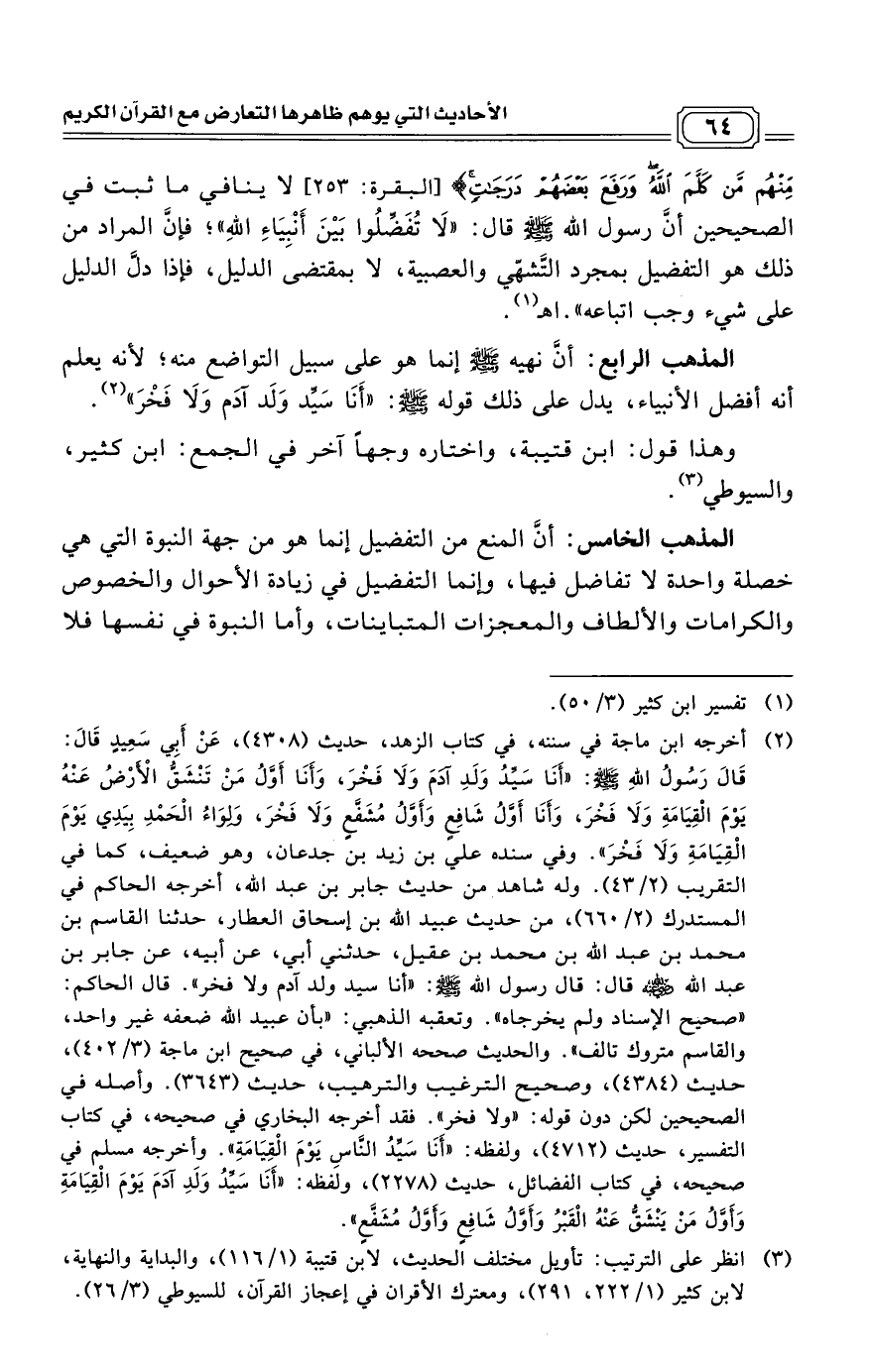المذهب الرابع: أنَّ نهيه - صلى الله عليه وسلم - إنما هو على سبيل التواضع منه؛ لأنه يعلم أنه أفضل الأنبياء، يدل على ذلك قوله - صلى الله عليه وسلم -: "أَنَا سَيِّد وَلَد آدَم وَلَا فَخْرَ". (¬2)
