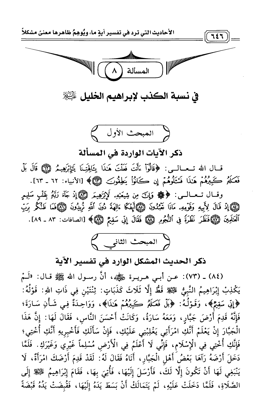(84) ـ (73): عن أبي هريرة - رضي الله عنه -، أنَّ رسول الله - صلى الله عليه وسلم - قال: «لَمْ يَكْذِبْ إِبْرَاهِيمُ النَّبِيُّ عَلَيْهِ السَّلَام قَطُّ إِلَّا ثَلَاثَ كَذَبَاتٍ: ثِنْتَيْنِ فِي ذَاتِ اللَّهِ: قَوْلُهُ: (إِنِّي سَقِيمٌ)، وَقَوْلُهُ: (بَلْ فَعَلَهُ كَبِيرُهُمْ هَذَا)، وَوَاحِدَةٌ فِي شَأْنِ سَارَةَ؛ فَإِنَّهُ قَدِمَ أَرْضَ جَبَّارٍ، وَمَعَهُ سَارَةُ، وَكَانَتْ أَحْسَنَ النَّاسِ، فَقَالَ لَهَا: إِنَّ هَذَا الْجَبَّارَ إِنْ يَعْلَمْ أَنَّكِ امْرَأَتِي يَغْلِبْنِي عَلَيْكِ، فَإِنْ سَأَلَكِ فَأَخْبِرِيهِ أَنَّكِ أُخْتِي؛ فَإِنَّكِ أُخْتِي فِي الْإِسْلَامِ، فَإِنِّي لَا أَعْلَمُ فِي الْأَرْضِ مُسْلِمًا غَيْرِي وَغَيْرَكِ. فَلَمَّا دَخَلَ أَرْضَهُ رَآهَا بَعْضُ أَهْلِ الْجَبَّارِ، أَتَاهُ فَقَالَ لَهُ: لَقَدْ قَدِمَ أَرْضَكَ امْرَأَةٌ، لَا يَنْبَغِي لَهَا أَنْ تَكُونَ إِلَّا لَكَ، فَأَرْسَلَ إِلَيْهَا، فَأُتِيَ بِهَا، فَقَامَ إِبْرَاهِيمُ عَلَيْهِ السَّلَام إِلَى الصَّلَاةِ، فَلَمَّا دَخَلَتْ عَلَيْهِ، لَمْ يَتَمَالَكْ أَنْ بَسَطَ يَدَهُ إِلَيْهَا، فَقُبِضَتْ يَدُهُ قَبْضَةً