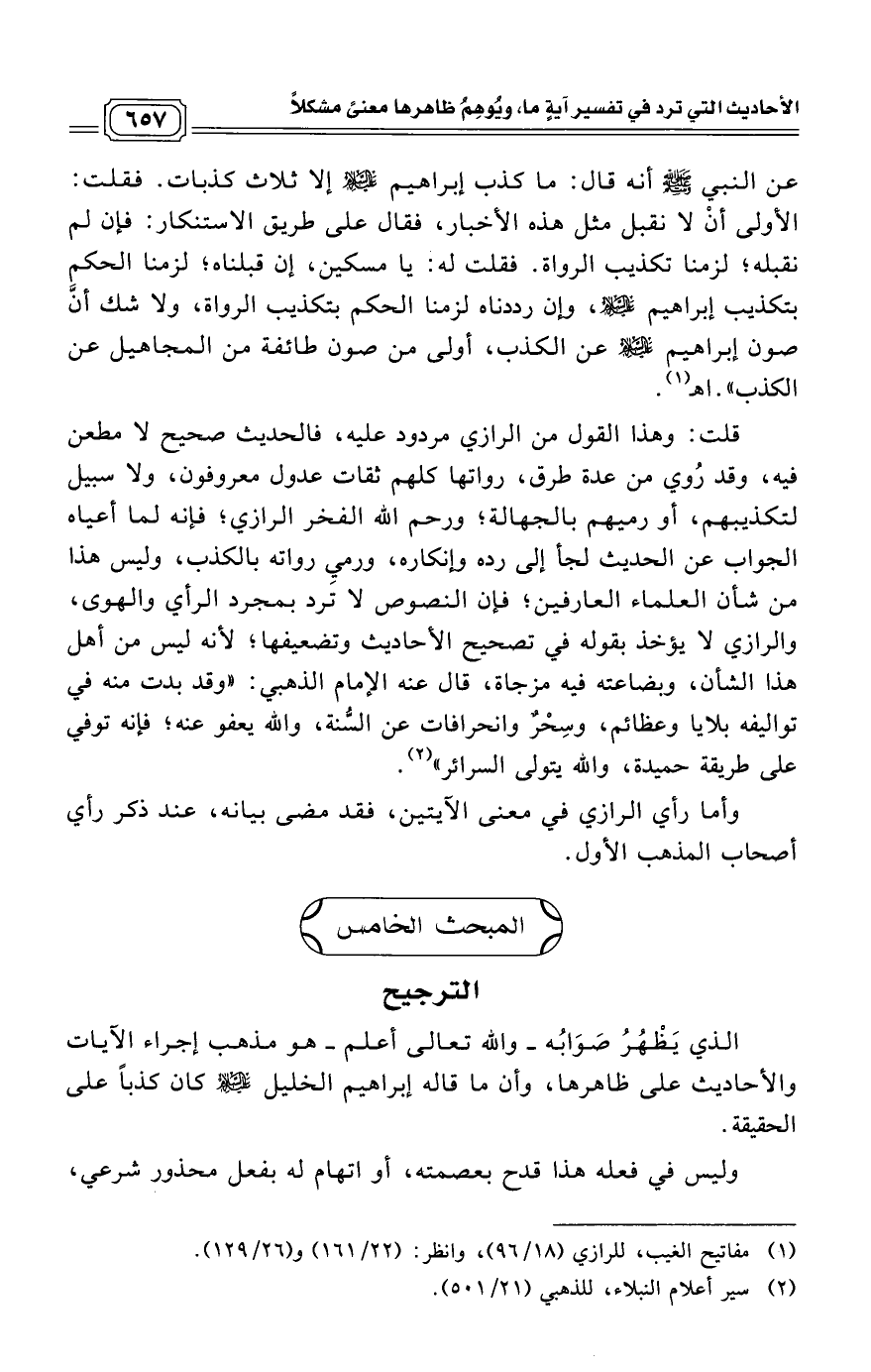 عن النبي - صلى الله عليه وسلم - أنه قال: ما كذب إبراهيم - عليه السلام - إلا ثلاث كذبات. فقلت: الأولى أنْ لا نقبل مثل هذه الأخبار، فقال على طريق الاستنكار: فإن لم نقبله؛ لزمنا تكذيب الرواة. فقلت له: يا مسكين، إن قبلناه؛ لزمنا الحكم بتكذيب إبراهيم - عليه السلام - وإن رددناه لزمنا الحكم بتكذيب الرواة، ولا شك أنَّ صون إبراهيم - عليه السلام - عن الكذب، أولى من صون طائفة من المجاهيل عن الكذب». اهـ (¬1)