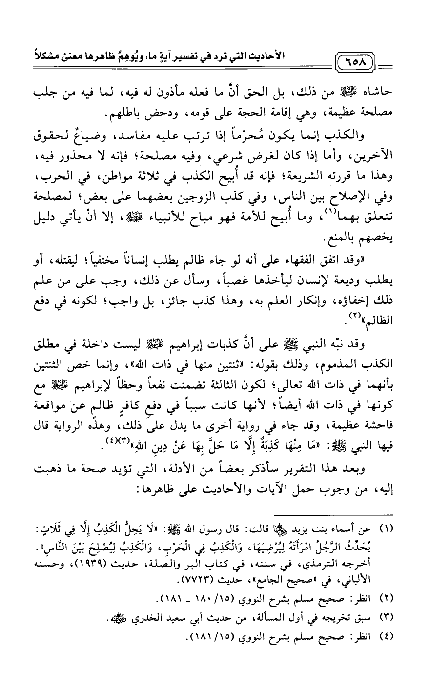 وقد نبّه النبي - صلى الله عليه وسلم - على أنَّ كذبات إبراهيم - عليه السلام - ليست داخلة في مطلق الكذب المذموم، وذلك بقوله: «ثنتين منها في ذات الله»، وإنما خص الثنتين بأنهما في ذات الله تعالى؛ لكون الثالثة تضمنت نفعاً وحظاً لإبراهيم - عليه السلام - مع كونها في ذات الله أيضاً؛ لأنها كانت سبباً في دفعِ كافرٍ ظالمٍ عن مواقعة فاحشة عظيمة، وقد جاء في رواية أخرى ما يدل على ذلك، وهذه الرواية قال فيها النبي - صلى الله عليه وسلم -: «مَا مِنْهَا كَذِبَةٌ إِلَّا مَا حَلَّ بِهَا عَنْ دِينِ اللَّهِ» (¬3). (¬4)