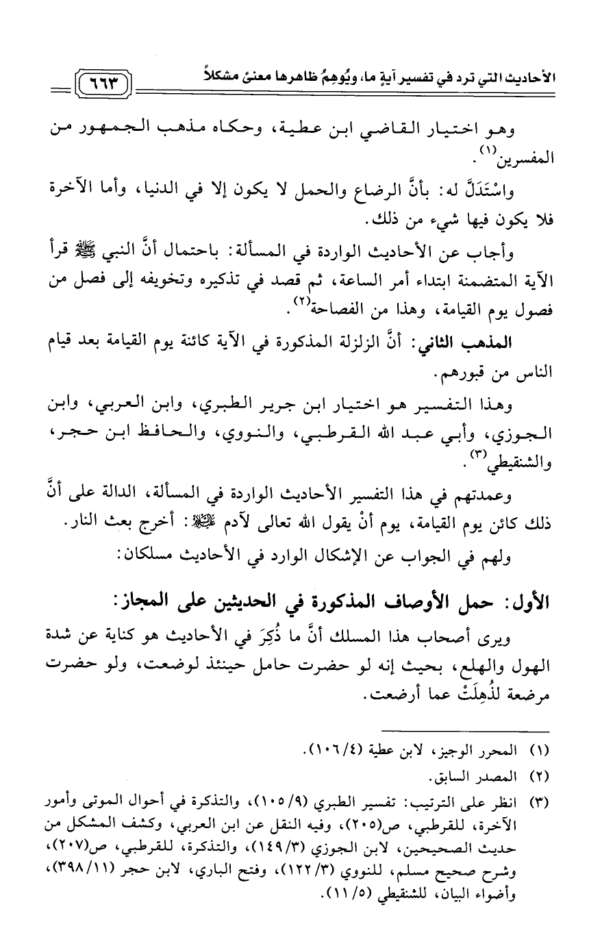 (¬3) انظر على الترتيب: تفسير الطبري (9/ 105)، والتذكرة في أحوال الموتى والآخرة، للقرطبي، ص (205)، وفيه النقل عن ابن العربي، وكشف المشكل من حديث الصحيحين، لابن الجوزي (3/ 149)، والتذكرة، للقرطبي، ص (207)، وشرح صحيح مسلم، للنووي (3/ 122)، وفتح الباري، لابن حجر (11/ 398)، وأضواء البيان، للشنقيطي (5/ 11).