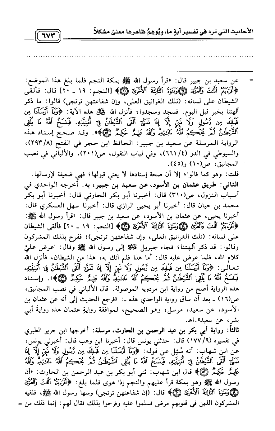 = عن سعيد بن جبير قال: «قرأ رسول الله - صلى الله عليه وسلم - بمكة النجم فلما بلغ هذا الموضع: (أفرأيتم اللَّاتَ وَالْعُزَّى (19) وَمَنَاةَ الثَّالِثَةَ الْأُخْرَى (20)) [النجم: 19 - 20] قال: فألقى الشيطان على لسانه: (تلك الغرانيق العلى، وإن شفاعتهن ترتجى) قالوا: ما ذكر آلهتنا بخير قبل اليوم. فسجد وسجدوا؛ فأنزل الله عز وجل هذه الآية: (وَمَا أَرْسَلْنَا مِن قَبْلِكَ مِن رَّسُولٍ وَلَا نَبِيٍّ إِلَّا إِذَا تَمَنَّى أَلْقَى الشَّيْطَانُ فِي أُمْنِيَّتِهِ فَيَنسَخُ اللَّهُ مَا يُلْقِي الشَّيْطَانُ ثُمَّ يُحْكِمُ اللَّهُ آيَاتِهِ وَاللَّهُ عَلِيمٌ حَكِيمٌ (52))».