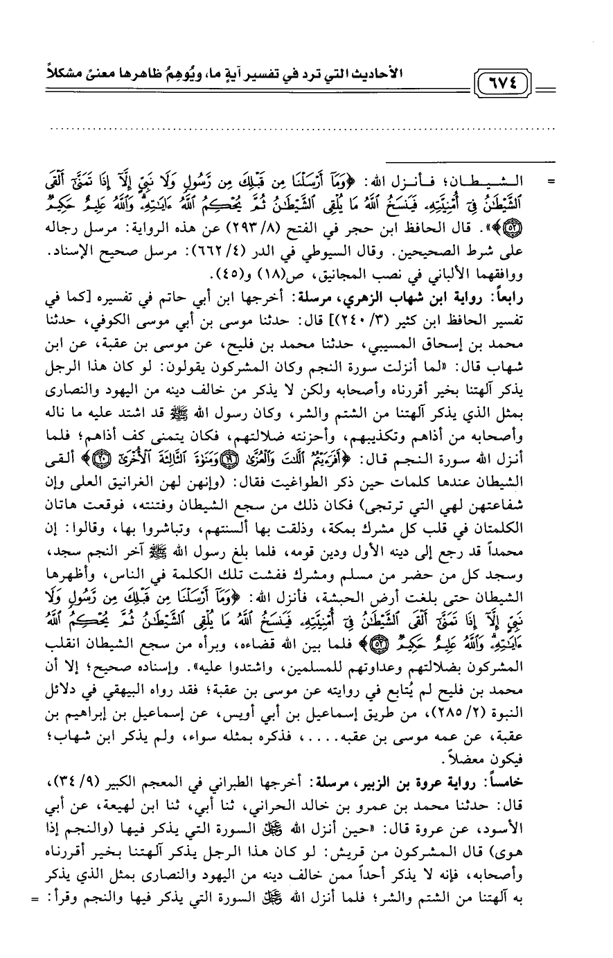 أخرجها ابن أبي حاتم في تفسيره [كما في تفسير الحافظ ابن كثير (3/ 240)] قال: حدثنا موسى بن أبي موسى الكوفي، حدثنا محمد بن إسحاق المسيبي، حدثنا محمد بن فليح، عن موسى بن عقبة، عن ابن شهاب قال: «لما أنزلت سورة النجم وكان المشركون يقولون: لو كان هذا الرجل يذكر آلهتنا بخير أقررناه وأصحابه ولكن لا يذكر من خالف دينه من اليهود والنصارى بمثل الذي يذكر آلهتنا من الشتم والشر، وكان رسول الله - صلى الله عليه وسلم - قد اشتد عليه ما ناله وأصحابه من أذاهم وتكذيبهم، وأحزنته ضلالتهم، فكان يتمنى كف أذاهم؛ فلما أنزل الله سورة النجم قال: (أفرأيتم اللَّاتَ وَالْعُزَّى (19) وَمَنَاةَ الثَّالِثَةَ الْأُخْرَى (20)) ألقى الشيطان عندها كلمات حين ذكر الطواغيت فقال: (وإنهن لهن الغرانيق العلى وإن شفاعتهن لهي التي ترتجى) فكان ذلك من سجع الشيطان وفتنته، فوقعت هاتان الكلمتان في قلب كل مشرك بمكة، وذلقت بها ألسنتهم، وتباشروا بها، وقالوا: إن محمداً قد رجع إلى دينه الأول ودين قومه، فلما بلغ رسول الله - صلى الله عليه وسلم - آخر النجم سجد، وسجد كل من حضر من مسلم ومشرك ففشت تلك الكلمة في الناس، وأظهرها الشيطان حتى بلغت أرض الحبشة، فأنزل الله: (وَمَا أَرْسَلْنَا مِن قَبْلِكَ مِن رَّسُولٍ وَلَا نَبِيٍّ إِلَّا إِذَا تَمَنَّى أَلْقَى الشَّيْطَانُ فِي أُمْنِيَّتِهِ فَيَنسَخُ اللَّهُ مَا يُلْقِي الشَّيْطَانُ ثُمَّ يُحْكِمُ اللَّهُ آيَاتِهِ وَاللَّهُ عَلِيمٌ حَكِيمٌ (52)) فلما بين الله قضاءه، وبرأه من سجع الشيطان انقلب المشركون بضلالتهم وعداوتهم للمسلمين، واشتدوا عليه».