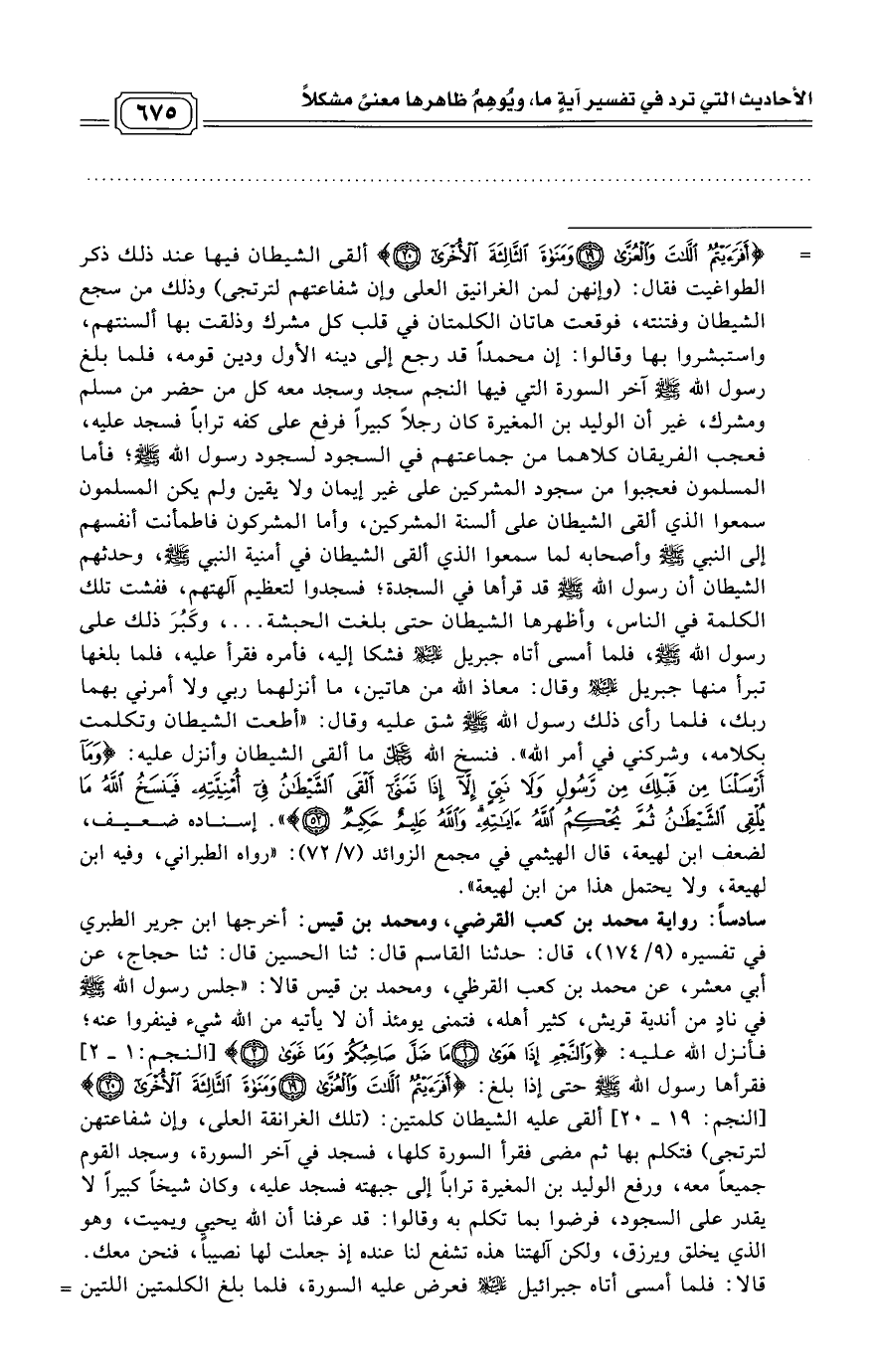 = (أفرأيتم اللَّاتَ وَالْعُزَّى (19) وَمَنَاةَ الثَّالِثَةَ الْأُخْرَى (20)) ألقى الشيطان فيها عند ذلك ذكر الطواغيت فقال: (وإنهن لمن الغرانيق العلى وإن شفاعتهم لترتجى) وذلك من سجع الشيطان وفتنته، فوقعت هاتان الكلمتان في قلب كل مشرك وذلقت بها ألسنتهم، واستبشروا بها وقالوا: إن محمداً قد رجع إلى دينه الأول ودين قومه، فلما بلغ رسول الله - صلى الله عليه وسلم - آخر السورة التي فيها النجم سجد وسجد معه كل من حضر من مسلم ومشرك، غير أن الوليد بن المغيرة كان رجلاً كبيراً فرفع على كفه تراباً فسجد عليه، فعجب الفريقان كلاهما من جماعتهم في السجود لسجود رسول الله - صلى الله عليه وسلم -؛ فأما المسلمون فعجبوا من سجود المشركين على غير إيمان ولا يقين ولم يكن المسلمون سمعوا الذي ألقى الشيطان على ألسنة المشركين، وأما المشركون فاطمأنت أنفسهم إلى النبي - صلى الله عليه وسلم - وأصحابه لما سمعوا الذي ألقى الشيطان في أمنية النبي - صلى الله عليه وسلم -، وحدثهم الشيطان أن رسول الله - صلى الله عليه وسلم - قد قرأها في السجدة؛ فسجدوا لتعظيم آلهتهم، ففشت تلك الكلمة في الناس، وأظهرها الشيطان حتى بلغت الحبشة ... ، وكَبُرَ ذلك على رسول الله - صلى الله عليه وسلم -، فلما أمسى أتاه جبريل عليه السلام فشكا إليه، فأمره فقرأ عليه، فلما بلغها تبرأ منها جبريل عليه السلام وقال: معاذ الله من هاتين، ما أنزلهما ربي ولا أمرني بهما ربك، فلما رأى ذلك رسول الله - صلى الله عليه وسلم - شق عليه وقال: أطعت الشيطان وتكلمت بكلامه، وشركني في أمر الله. فنسخ الله عز وجل ما ألقى الشيطان وأنزل عليه: (وَمَا أَرْسَلْنَا مِن قَبْلِكَ مِن رَّسُولٍ وَلَا نَبِيٍّ إِلَّا إِذَا تَمَنَّى أَلْقَى الشَّيْطَانُ فِي أُمْنِيَّتِهِ فَيَنسَخُ اللَّهُ مَا يُلْقِي الشَّيْطَانُ ثُمَّ يُحْكِمُ اللَّهُ آيَاتِهِ وَاللَّهُ عَلِيمٌ حَكِيمٌ (52))».