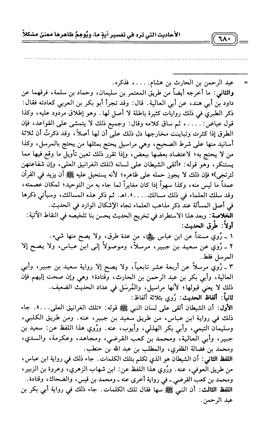 قال: وقد تجرأ أبو بكر بن العربي كعادته فقال: ذكر الطبري في ذلك روايات كثيرة باطلة لا أصل لها. وهو إطلاق مردود عليه، وكذا قول عياض: .... ، ثم ساق كلامه وقال: وجميع ذلك لا يتمشى على القواعد، فإن الطرق إذا كثرت وتباينت مخارجها دل ذلك على أن لها أصلاً، وقد ذكرتُ أن ثلاثة أسانيد منها على شرط الصحيح، وهي مراسيل يحتج بمثلها من يحتج بالمرسل، وكذا من لا يحتج به؛ لاعتضاد بعضها ببعض، وإذا تقرر ذلك تعين تأويل ما وقع فيها مما يستنكر، وهو قوله: «ألقى الشيطان على لسانه (تلك الغرانيق العلى، وإن شفاعتهن لترتجى)» فإن ذلك لا يجوز حمله على ظاهره؛ لأنه يستحيل عليه - صلى الله عليه وسلم - أن يزيد في القرآن عمداً ما ليس منه، وكذا سهواً إذا كان مغايراً لما جاء به من التوحيد؛ لمكان عصمته، وقد سلك العلماء في ذلك مسالك .... ». اهـ. ثم ذكر هذه المسالك، وسيأتي ذكرها في أصل المسألة عند ذكر مذاهب العلماء تجاه الإشكال الوارد في الحديث.