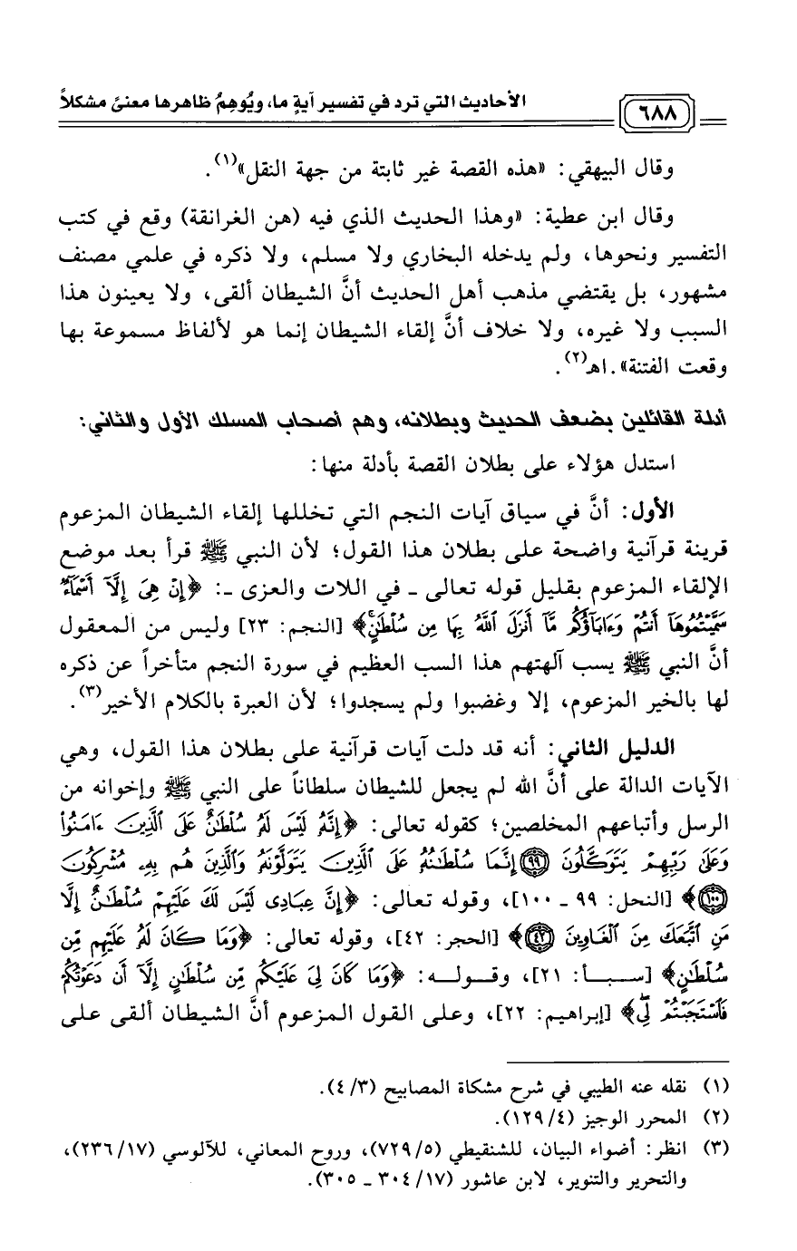 وقال ابن عطية: «وهذا الحديث الذي فيه (هن الغرانقة) وقع في كتب التفسير ونحوها، ولم يدخله البخاري ولا مسلم، ولا ذكره في علمي مصنف مشهور، بل يقتضي مذهب أهل الحديث أنَّ الشيطان ألقى، ولا يعينون هذا السبب ولا غيره، ولا خلاف أنَّ إلقاء الشيطان إنما هو لألفاظ مسموعة بها وقعت الفتنة». اهـ (¬2)