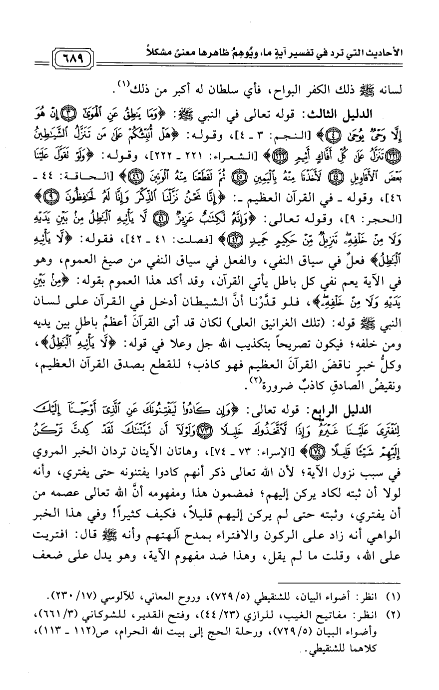الدليل الثالث: قوله تعالى في النبي - صلى الله عليه وسلم -: (وَمَا يَنطِقُ عَنِ الْهَوَى (3) إِنْ هُوَ إِلَّا وَحْيٌ يُوحَى (4)) [النجم: 3 - 4]، وقوله: (هَلْ أُنَبِّئُكُمْ عَلَى مَن تَنَزَّلُ الشَّيَاطِينُ (221) تَنَزَّلُ عَلَى كُلِّ أَفَّاكٍ أَثِيمٍ (222)) [الشعراء: 221 - 222]، وقوله: (وَلَوْ تَقَوَّلَ عَلَيْنَا بَعْضَ الْأَقَاوِيلِ (44) لَأَخَذْنَا مِنْهُ بِالْيَمِينِ (45) ثُمَّ لَقَطَعْنَا مِنْهُ الْوَتِينَ (46)) [الحاقة: 44 - 46]، وقوله - في القرآن العظيم -: (إِنَّا نَحْنُ نَزَّلْنَا الذِّكْرَ وَإِنَّا لَهُ لَحَافِظُونَ (9)) [الحجر: 9]، وقوله تعالى: (وَإِنَّهُ لَكِتَابٌ عَزِيزٌ (41) لَا يَأْتِيهِ الْبَاطِلُ مِن بَيْنِ يَدَيْهِ وَلَا مِنْ خَلْفِهِ تَنزِيلٌ مِّنْ حَكِيمٍ حَمِيدٍ (42)) [فصلت: 41 - 42]، فقوله: (لَا يَأْتِيهِ الْبَاطِلُ) فعلٌ في سياق النفي، والفعل في ساق النفي من صيغ العموم، وهو في الآية يعم نفي كل باطل يأتي القرآن، وقد أكد هذا العموم بقوله: (مِن بَيْنِ يَدَيْهِ وَلَا مِنْ خَلْفِهِ)، فلو قدَّرْنا أنَّ الشيطان أدخل في القرآن على لسان النبي - صلى الله عليه وسلم - قوله: (تلك الغرانيق العلى) لكان قد أتى القرآنَ أعظمُ باطلٍ بين يديه ومن خلفه؛ فيكون تصريحاً بتكذيب الله جل وعلا في قوله: (لَا يَأْتِيهِ الْبَاطِلُ)، وكلُّ خبرٍ ناقضَ القرآنَ العظيم فهو كاذب؛ للقطع بصدق القرآن العظيم، ونقيضُ الصادقِ كاذبٌ ضرورة. (¬2)