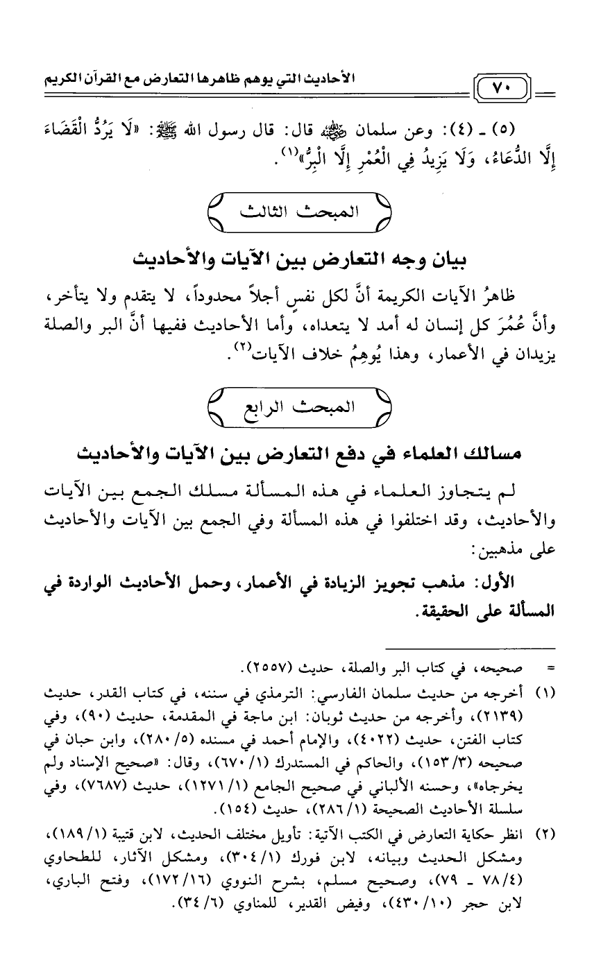 ظاهرُ الآيات الكريمة أنَّ لكل نفسٍ أجلاً محدوداً، لا يتقدم ولا يتأخر، وأنَّ عُمُرَ كل إنسان له أمد لا يتعداه، وأما الأحاديث ففيها أنَّ البر والصلة يزيدان في الأعمار، وهذا يُوهِمُ خلاف الآيات. (¬2)