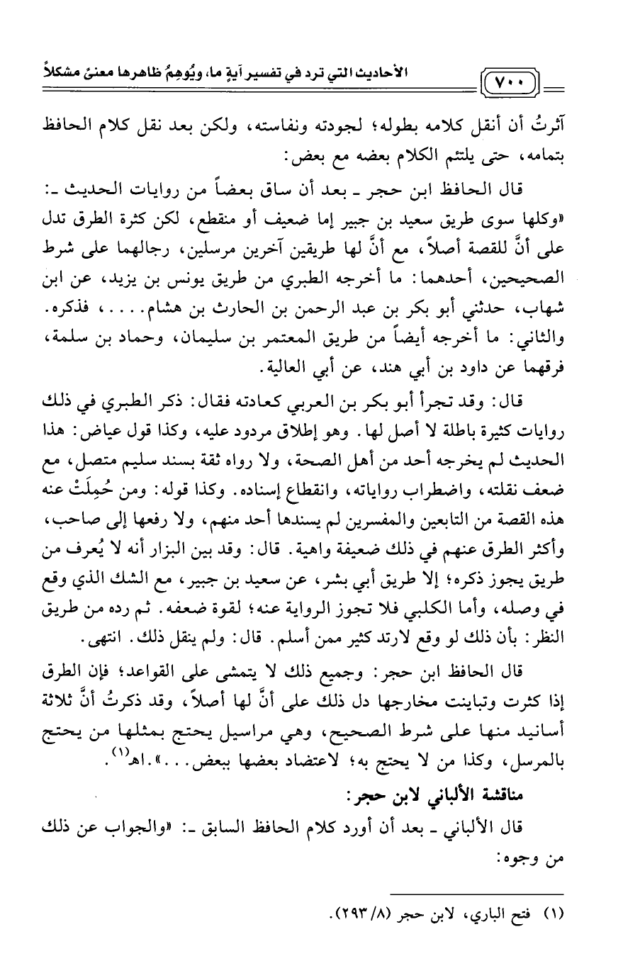 آثرتُ أن أنقل كلامه بطوله؛ لجودته ونفاسته، ولكن بعد نقل كلام الحافظ بتمامه، حتى يلتئم الكلام بعضه مع بعض: