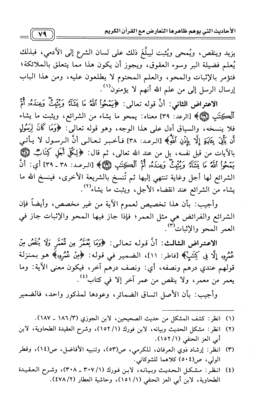 وأجيب: بأن هذا تخصيص لعموم الآية من غير مخصص، وأيضاً فإن الشرائع والفرائض هي مثل العمر؛ فإذا جاز فيها المحو والإثبات جاز في العمر المحو والإثبات. (¬3)