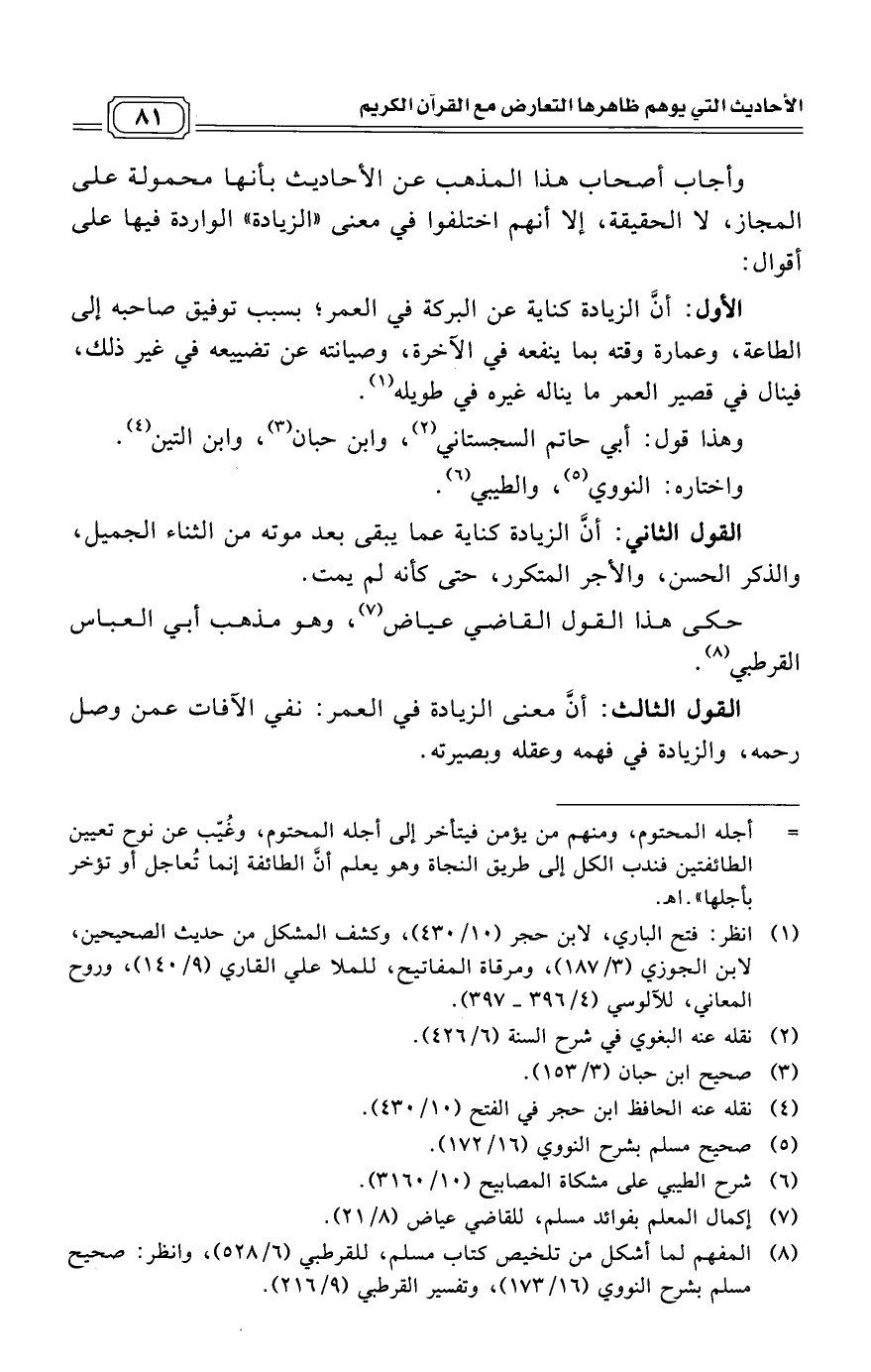 الأول: أنَّ الزيادة كناية عن البركة في العمر؛ بسبب توفيق صاحبه إلى الطاعة، وعمارة وقته بما ينفعه في الآخرة، وصيانته عن تضييعه في غير ذلك، فينال في قصير العمر ما يناله غيره في طويله. (¬1)