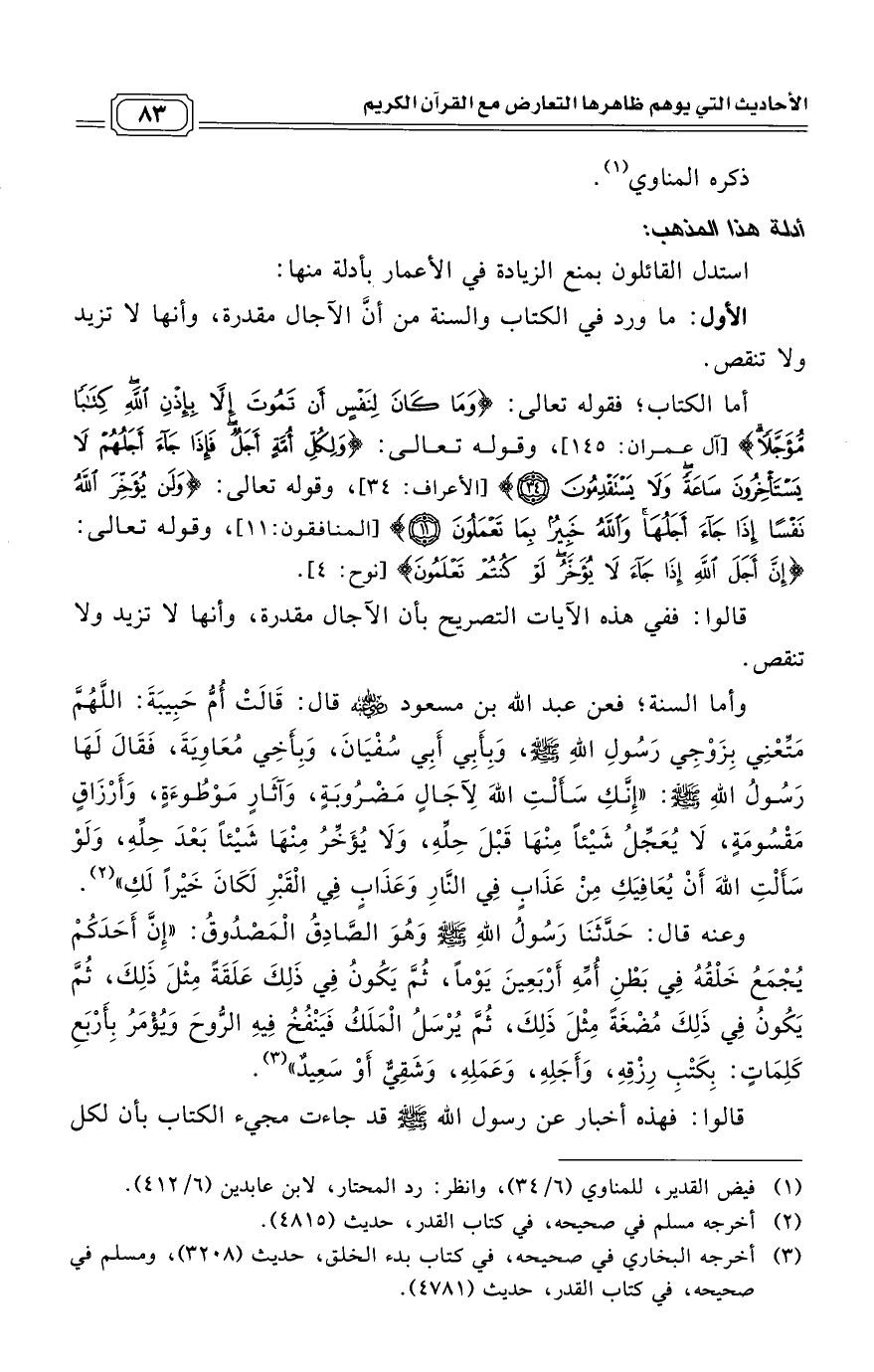 الأول: ما ورد في الكتاب والسنة من أنَّ الآجال مقدرة، وأنها لا تزيد ولا تنقص.