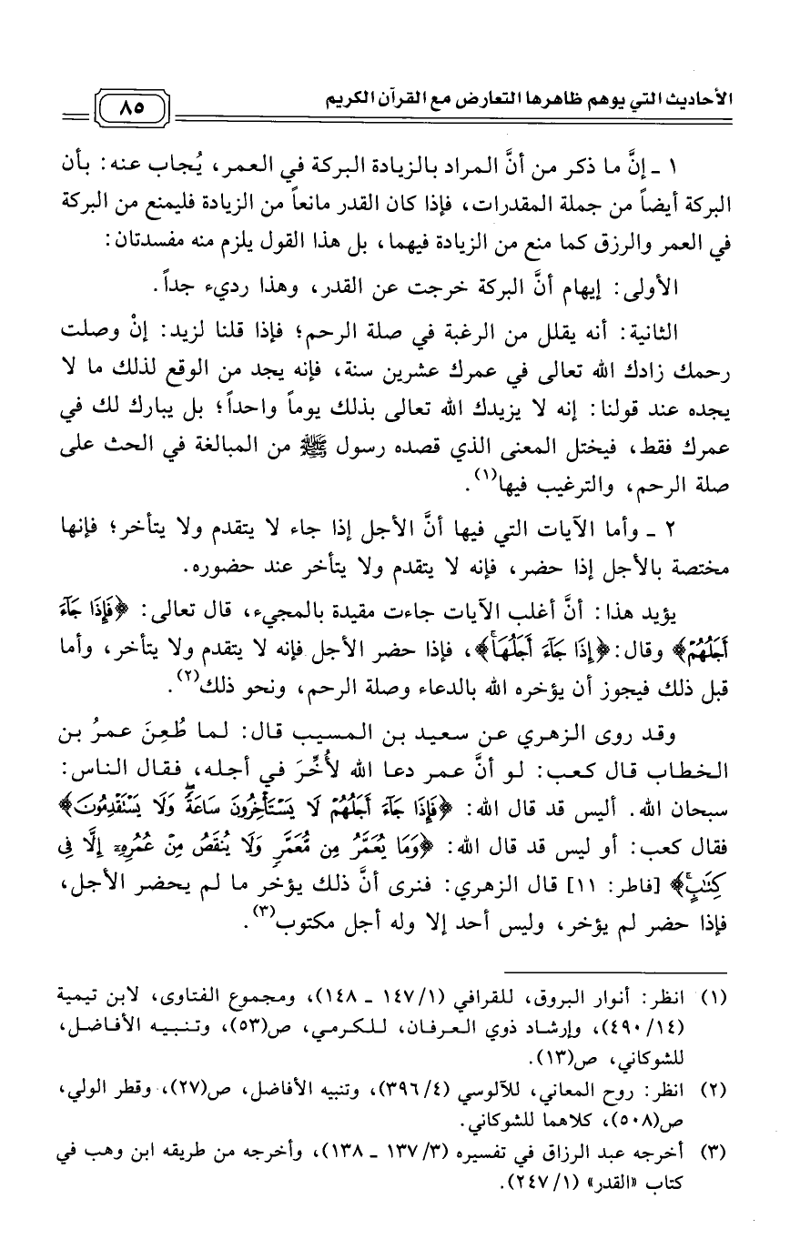 1 - إنَّ ما ذكر من أنَّ المراد بالزيادة البركة في العمر، يُجاب عنه: بأن البركة أيضاً من جملة المقدرات، فإذا كان القدر مانعاً من الزيادة فليمنع من البركة في العمر والرزق كما منع من الزيادة فيهما، بل هذا القول يلزم منه مفسدتان: