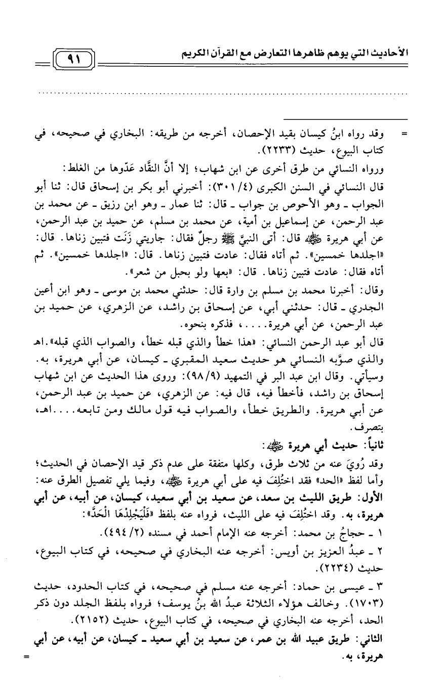 قال النسائي في السنن الكبرى (4/ 301): أخبرني أبو بكر بن إسحاق قال: ثنا أبو الجواب - وهو الأحوص بن جواب - قال: ثنا عمار - وهو ابن رزيق - عن محمد بن عبد الرحمن، عن إسماعيل بن أمية، عن محمد بن مسلم، عن حميد بن عبد الرحمن، عن أبي هريرة - رضي الله عنه - قال: أتى النبيَّ - صلى الله عليه وسلم - رجلٌ فقال: جاريتي زَنَت فتبين زناها. قال: "اجلدها خمسين". ثم أتاه فقال: عادت فتبين زناها. قال: "اجلدها خمسين". ثم أتاه فقال: عادت فتبين زناها. قال: "بعها ولو بحبل من شعر".