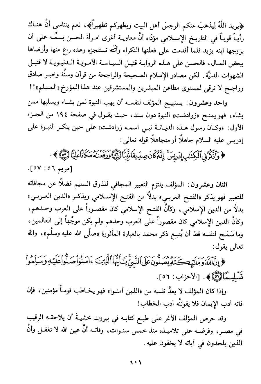 المؤلف يلتزم التعبير المجافى للذوق السليم، فضلاً عن مجافاته للتعبير، فهو يذكر " الفتح العربى " بدلاً من الفتح الإسلامى، ويذكر " الدين العربى " بدلاً من الدين الإسلامى، وكأن الفتح الإسلامى كان مقصوراً على العرب وحدهم ولم يكن موجهاً إلى العالمين، وما سمح لنفسه قط أن يتبع ذكر محمد بالعبارة المأثورة " صلى الله عليه وسلم " والله تعالى يقول: " إن الله وملائكته يصلون على النبى، يا أيها الذين آمنوا صلوا عليه وسلموا تسليماً " (الأحزاب: 56) وإذا كان المؤلف لا يعد نفسه من " الذين آمنوا " فهو يخاطب قوماً مؤمنين، فإن فاته أدب الإيمان فلا يفوتنه أدب الخطاب!