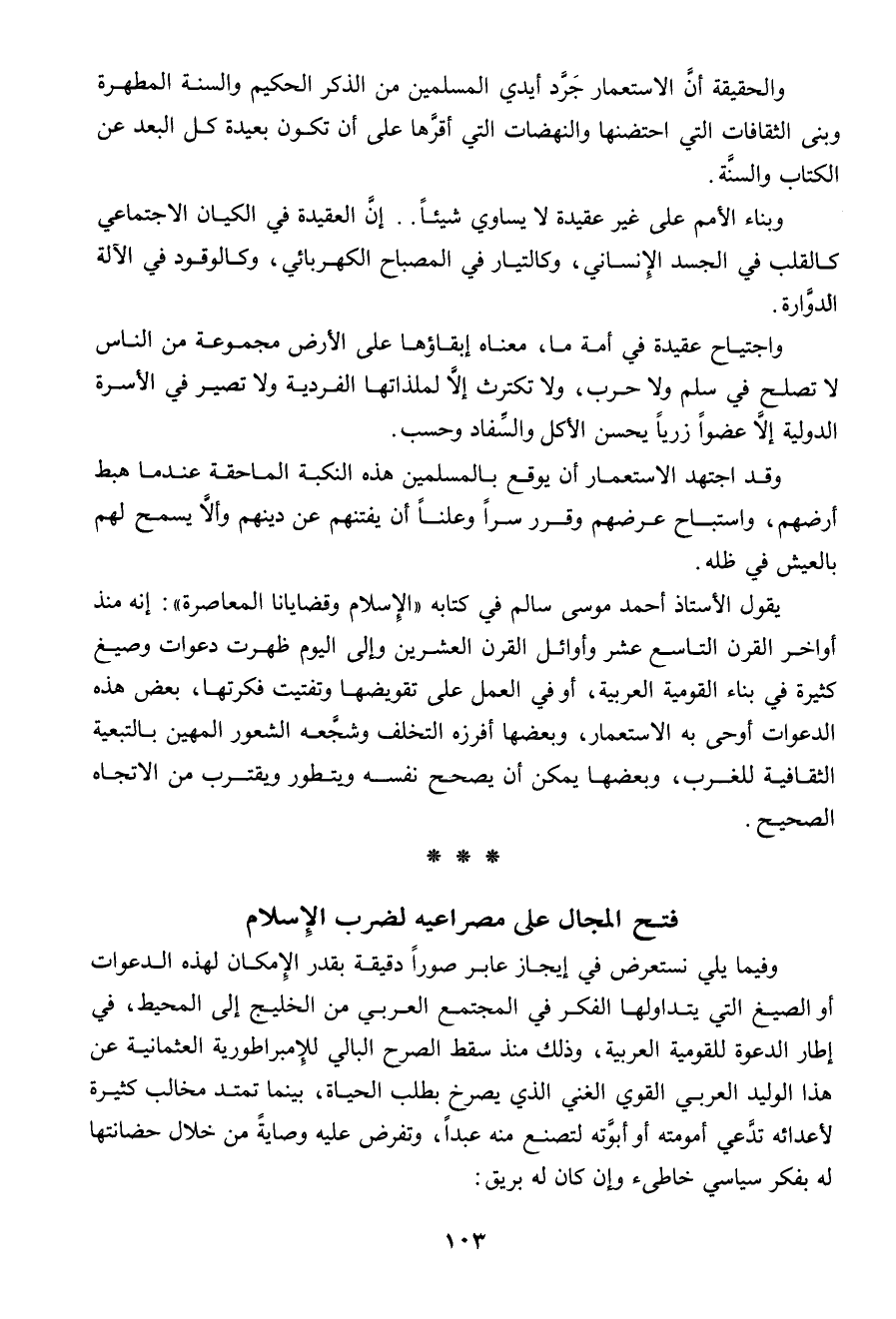 والحقيقة أن الاستعمار جرد أيدى المسلمين من الذكر الحكيم والسنة المطهرة، وبنى الثقافات التى احتضنها والنضهات التى أقرها على أن تكون بعيدة كل البعد عن الكتاب والسنة.
