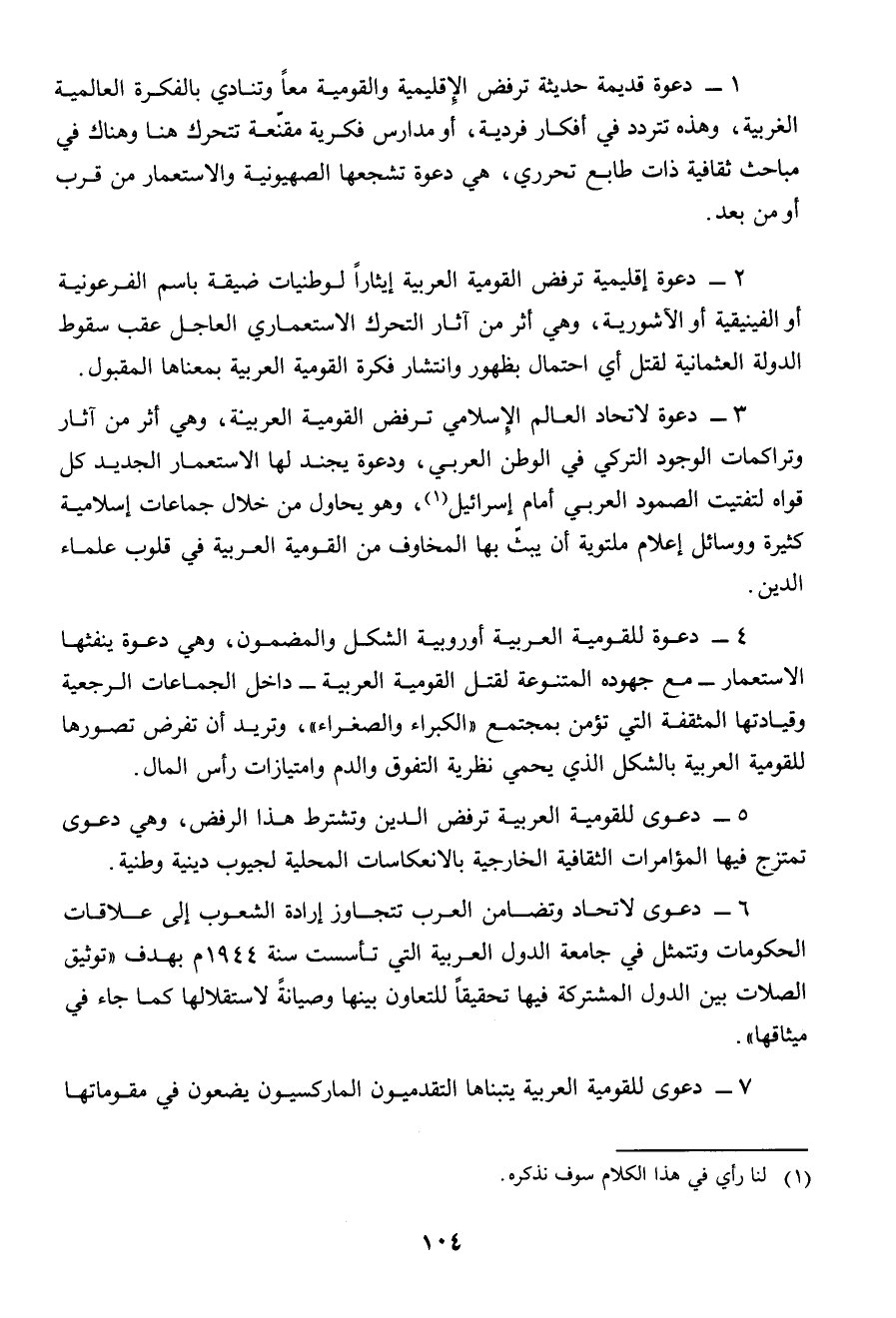 4 ـ دعوة للقومية العربية أوربية الشكل والمضمون، وهى دعوة ينفثها الاستعمار ـ مع جهوده المتنوعة لقتل القومية العربية ـ داخل الجماعات الرجعية وقيادتها المثقفة التى تؤمن بمجتمع " الكبراء والصغراء "، وتريد أن تفرض تصورها للقومية العربية بالشكل الذى يحمى نظرية التفوق والدم وامتيازات رأس المال.