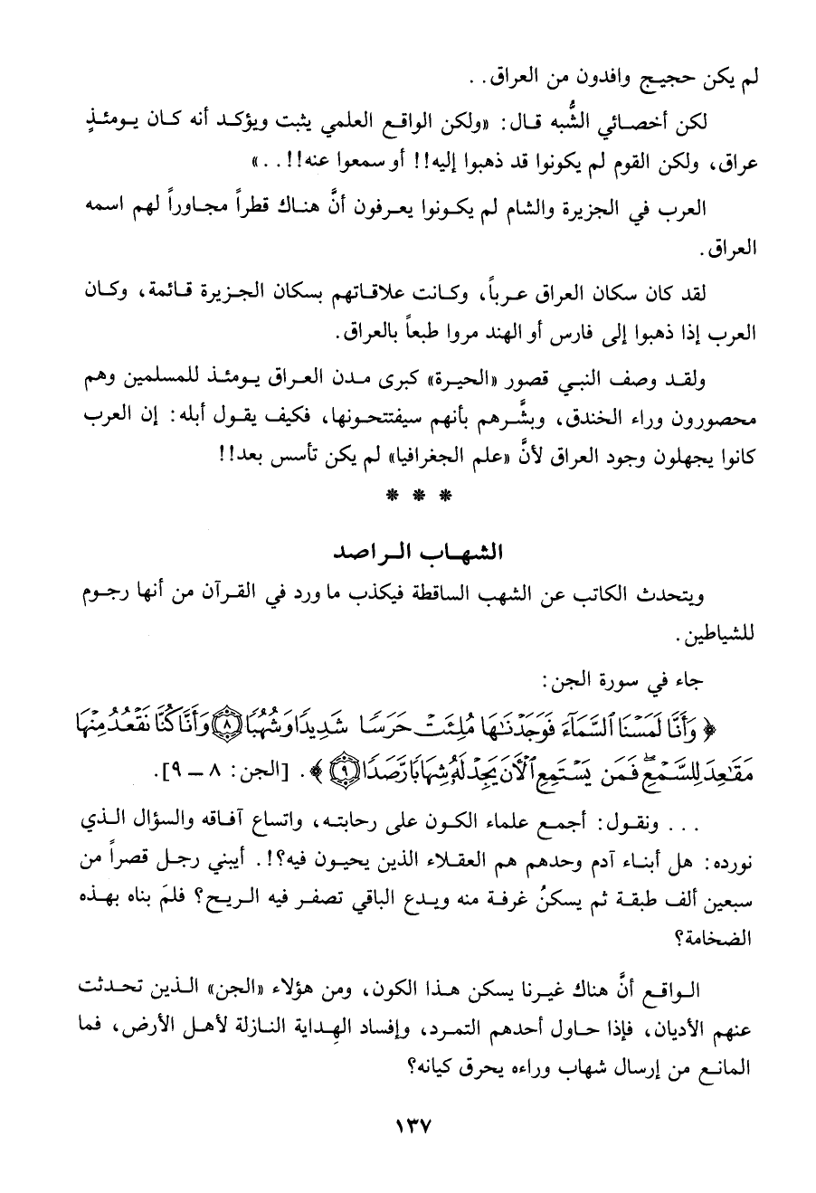 ويتحدث الكاتب عن الشهب الساقطة فيكذب ما ورد فى القرآن من أنها رجوم للشياطين.