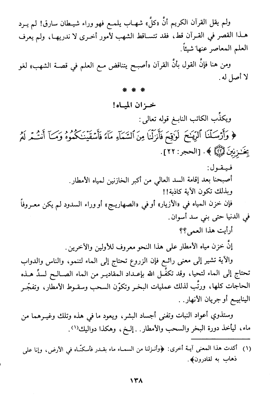 ولم يقل القرآن الكريم إن " كل " شهاب يلمع فهو وراء شيطان سارق! لم يرد هذا القصر فى القرآن قط، فقد تتساقط الشهب لأمور أخرى لا ندريها ولم يعرف العلم المعاصر عنها شيئاً.