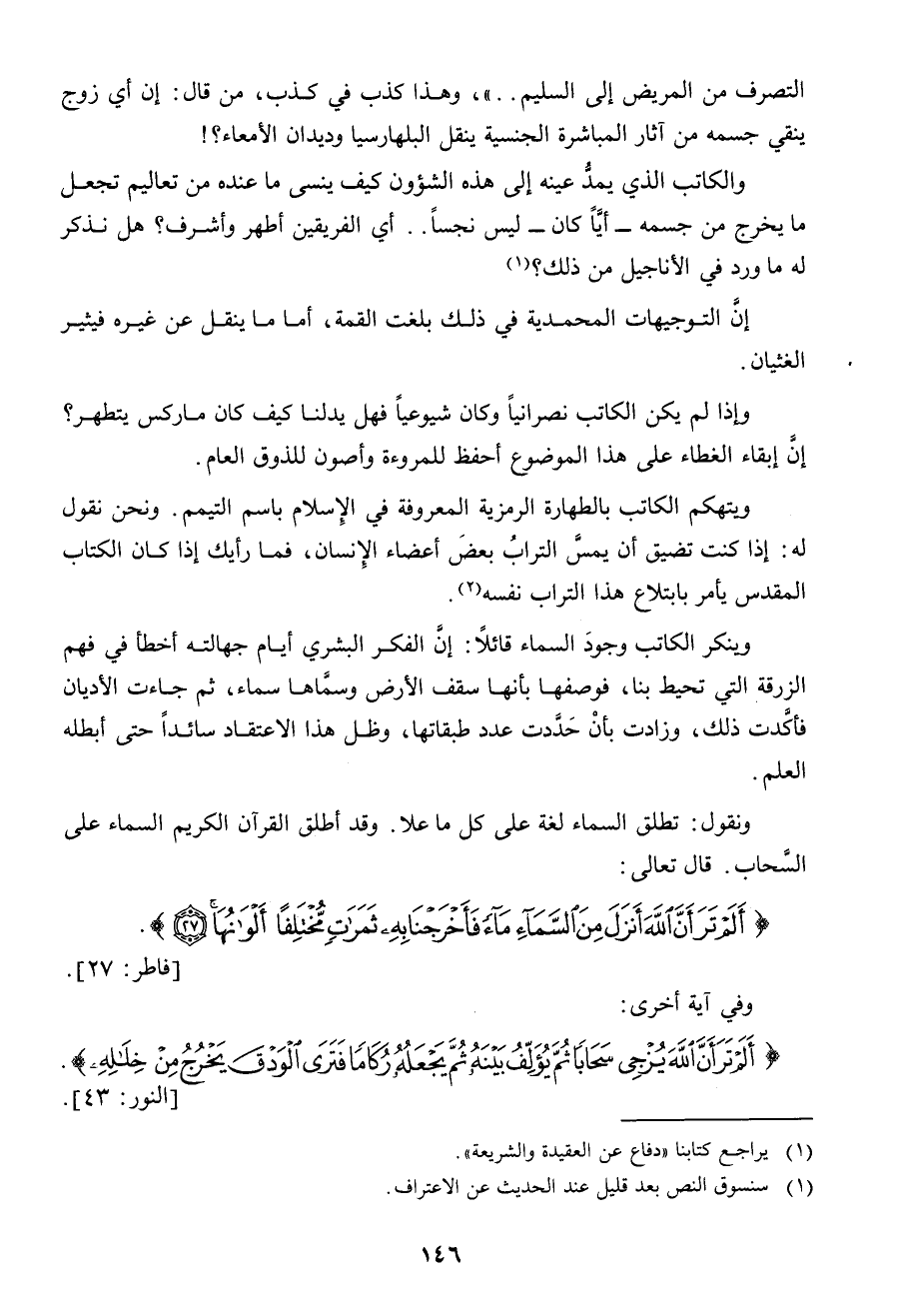 وإذا لم يكن الكاتب نصرانياً وكان شيوعياً فهل يدلنا كيف كان ماركس يتطهر؟ إن إبقاء الغطاء على هذا الموضوع أحفظ للمروءة وأصون للذوق العام!