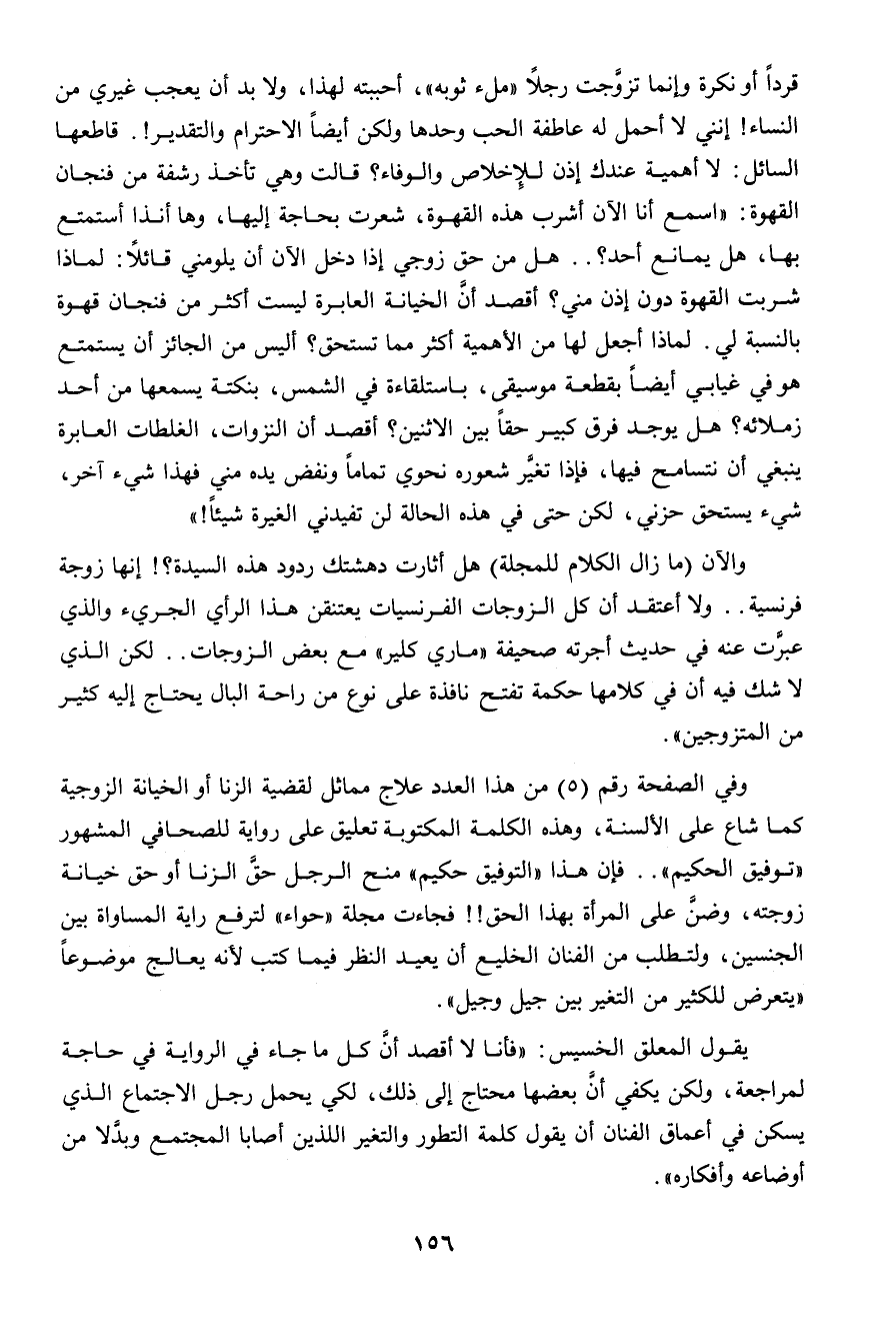 وفى الصفحة رقم (5) من هذا العدد علاج مماثل لقضية الزنا أو الخيانة الزوجية كما شاع على الألسنة، وهذه الكلمة المكتوبة تعليق على رواية للصحافى المشهور " توفيق الحكيم ".. فإن هذا " التوفيق حكيم " منح الرجل حق الزنا أو حق خيانة زوجته، وضن على المرأة بهذا الحق!! فجاءت مجلة " حواء " لترفع راية المساواة بين الجنسين، ولتطلب من الفنان الخليع أن يعيد النظر فيما كتب لأنه يعالج موضوعاً " يتعرض للكثير من التغير بين جيل وجيل ".