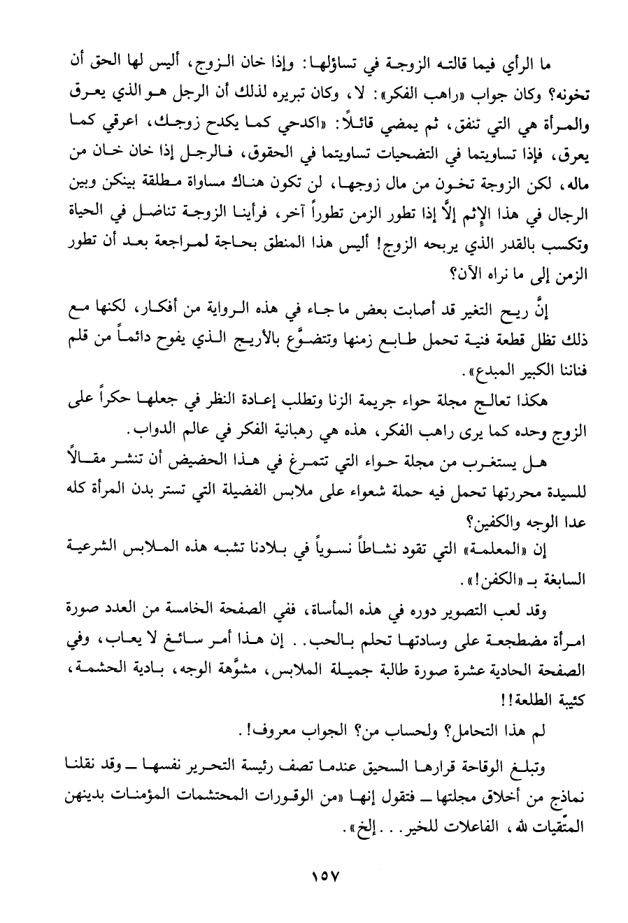 ما الرأى فيما قالته الزوجة فى تساؤلها: وإذا خان الزوج، أليس لها الحق أن تخونه؟.. وكان جواب " راهب الفكر ": لا، وكان تبريره لذلك أن الرجل هو الذى يعرق والمرأة هى التى تنفق، ثم يمضى قائلاً: اكدحى كما يكدح زوجك، اعرقى كما يعرق فإذا تساويتما فى التضحيات تساويتما فى الحقوق، فالرجل إذا خان خان من ماله، لكن الزوجة تخون من مال زوجها، لن تكون هناك مساواة مطلقة بينكن وبين الرجال فى هذا الإثم إلا إذا تطور الزمن تطوراً آخر فرأينا الزوجة تناضل فى الحياة وتكتسب بالقدر الذى يربحه الزوج!.. أليس هذا المنطق بحاجة لمراجعة بعد أن تطور الزمن إلى ما نراه الآن؟.. إن ريح التغير قد أصابت بعض ما جاء فى هذه من أفكار، لكنها مع ذلك تظل قطعة فنية تحمل طابع زمنها وتتضوع بالأريج الذى يفوح دائماً من قلم فناننا الكبير المبدع ".