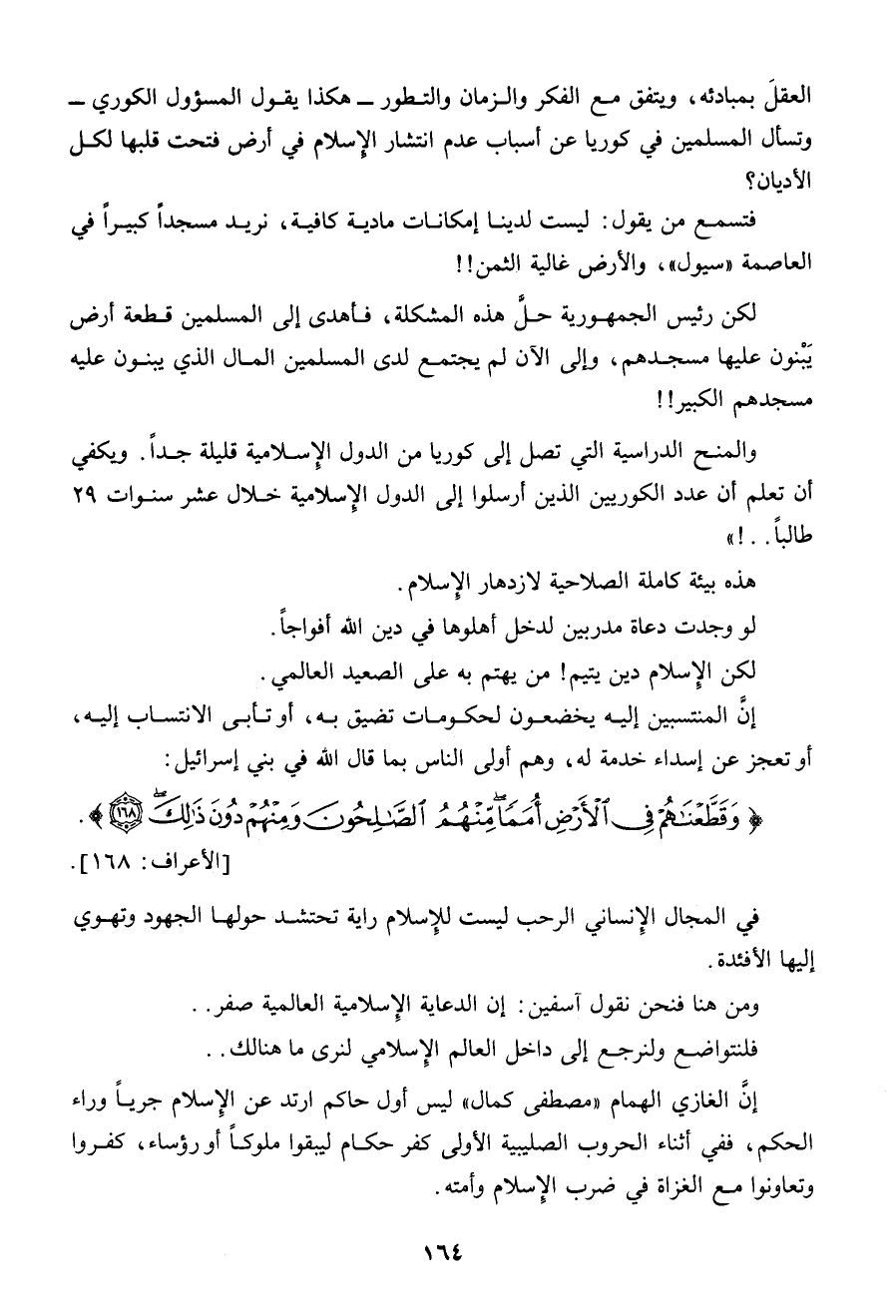 العقل بمبادئه ويتفق مع الفكر والزمان والتطور ـ هكذا يقول المسئول الكورى ـ وتسأل المسلمين فى كوريا عن أسباب عدم انتشار الإسلام فى أرض فتحت قلبها لكل الأديان؟