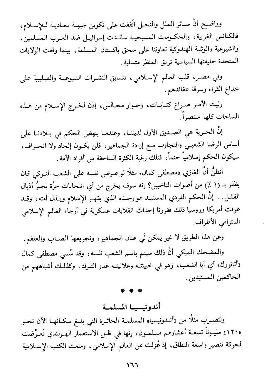 وواضح أن سائر الملل والنحل اتفقت على تكوين جبهة معادية للإسلام، فالكنائس الغربية والحكومات المسيحية ساندت إسرائيل ضد العرب المسلمين، والشيوعية والوثنية الهندوكية تعاونتا على سحق باكستان المسلمة، بينما وقفت الولايات المتحدة حليفتها السياسية ترمق المنظر متسلية.