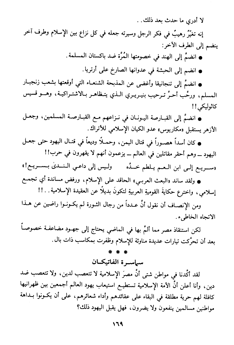 لقد أكدنا فى مواطن شتى أن مصر الإسلامية لا تتعصب لدين، ولا تتعصب ضد دين، وأنا أعلن أن الأمة الإسلامية تستطيع استيعاب يهود العالم أجمعين بين ظهرانيها كافلة لهم حرية مطلقة فى البقاء على عقائدهم وأداء شعائرهم، على أن يكونوا بداهة مواطنين مسالمين ينفعون ولا يضرون، فهل يقبل اليهود ذلك؟