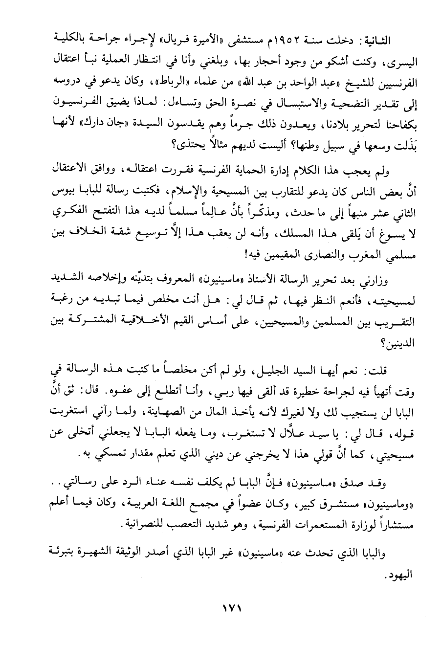 وقد صدق " ماسينيون "، فإن البابا لم يكلف نفسه عناء الرد على رسالتى.. " وماسينيون " مستشرق كبير، وكان عضواً فى مجمع اللغة العربية، وكان فيما أعلم مستشاراً لوزارة المستعمرات الفرنسية، وهو شديد التعصب للنصرانية.