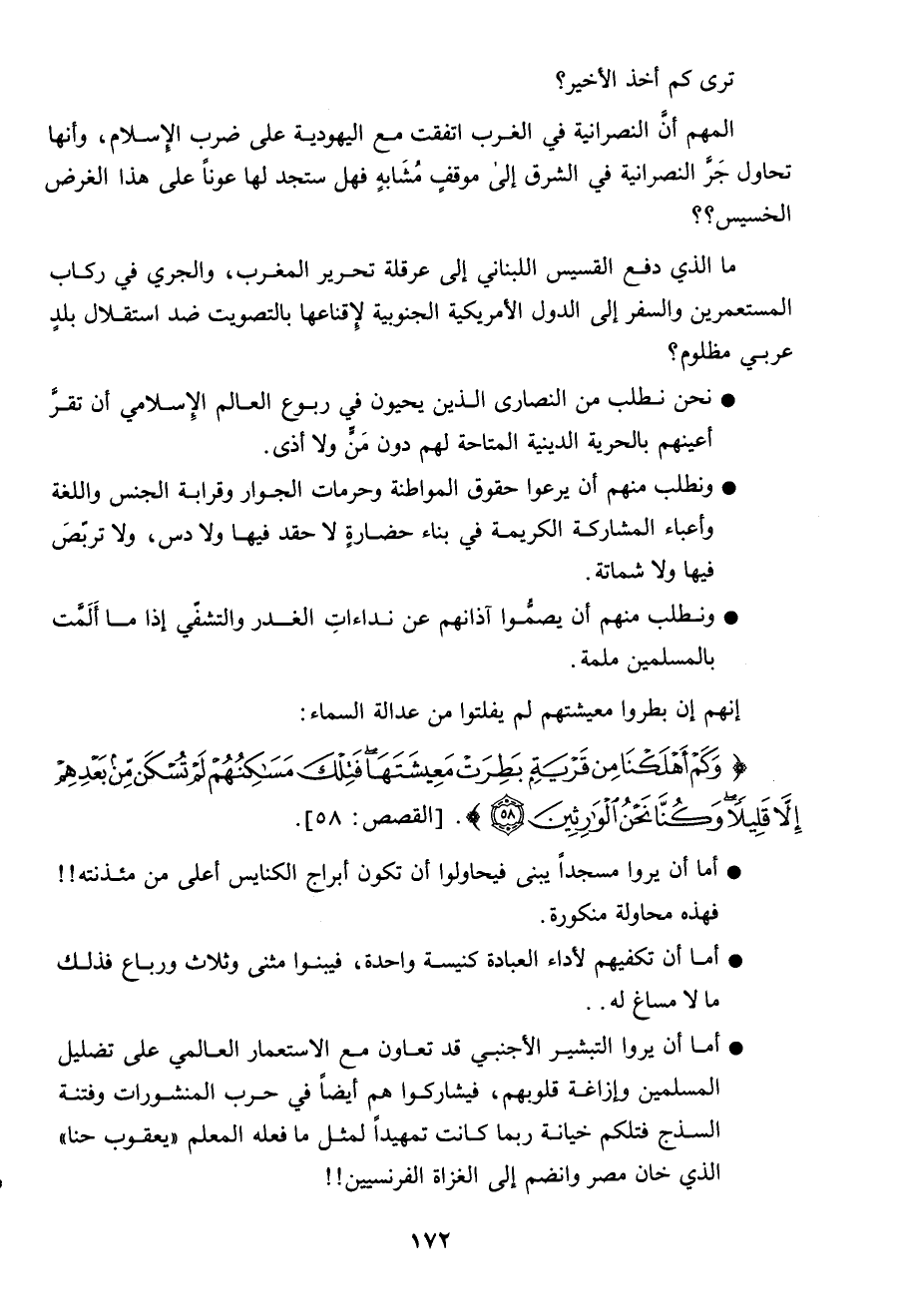 ـ نحن نطلب من النصارى الذين يحيون فى ربوع العالم الإسلامى أن تقر أعينهم بالحرية الدينية المتاحة لهم دون مَنٍ ولا أذى.