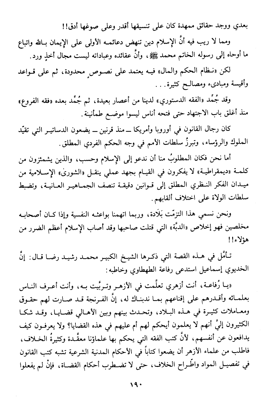 أما نحن فكان المطلوب منا أن ندعو إلى الإسلام.. وحسب، والذين يشمئزون من كلمة " ديمقراطية " لا يفكرون فى القيام بجهد عملى بنقل " الشورى " الإسلامية من ميدان الفكر النظرى المطلق إلى قوانين دقيقة تنصف الجماهير العانية وتضبط سلطات الولاة على اختلاف ألقابهم.