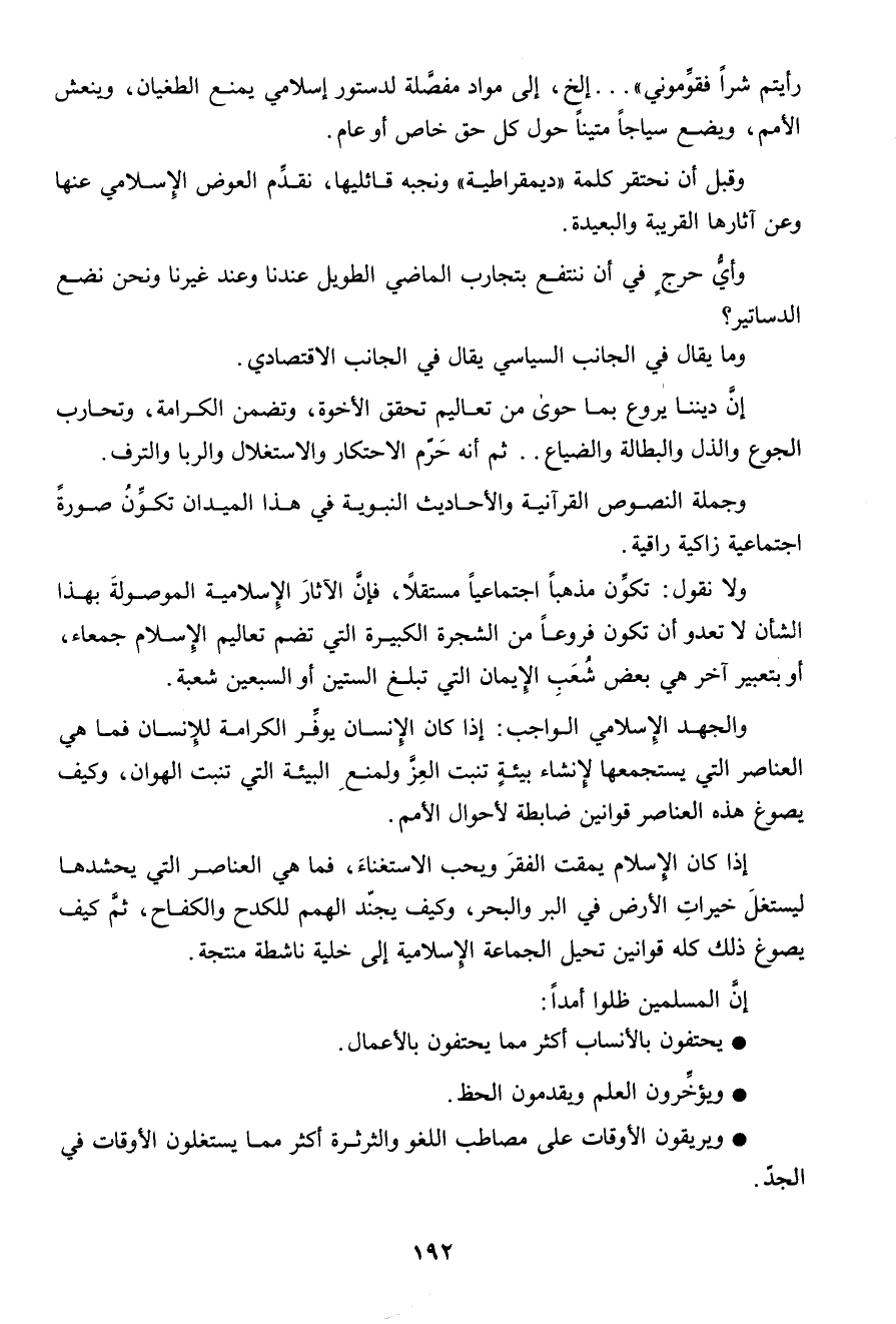 رأيتم شراً فقومونى ".. إلخ.. إلى مواد مفصلة لدستور إسلامى يمنع الطغيان، وينعش الأمم، ويضع سياجاً متيناً حول كل حق خاص أو عام..