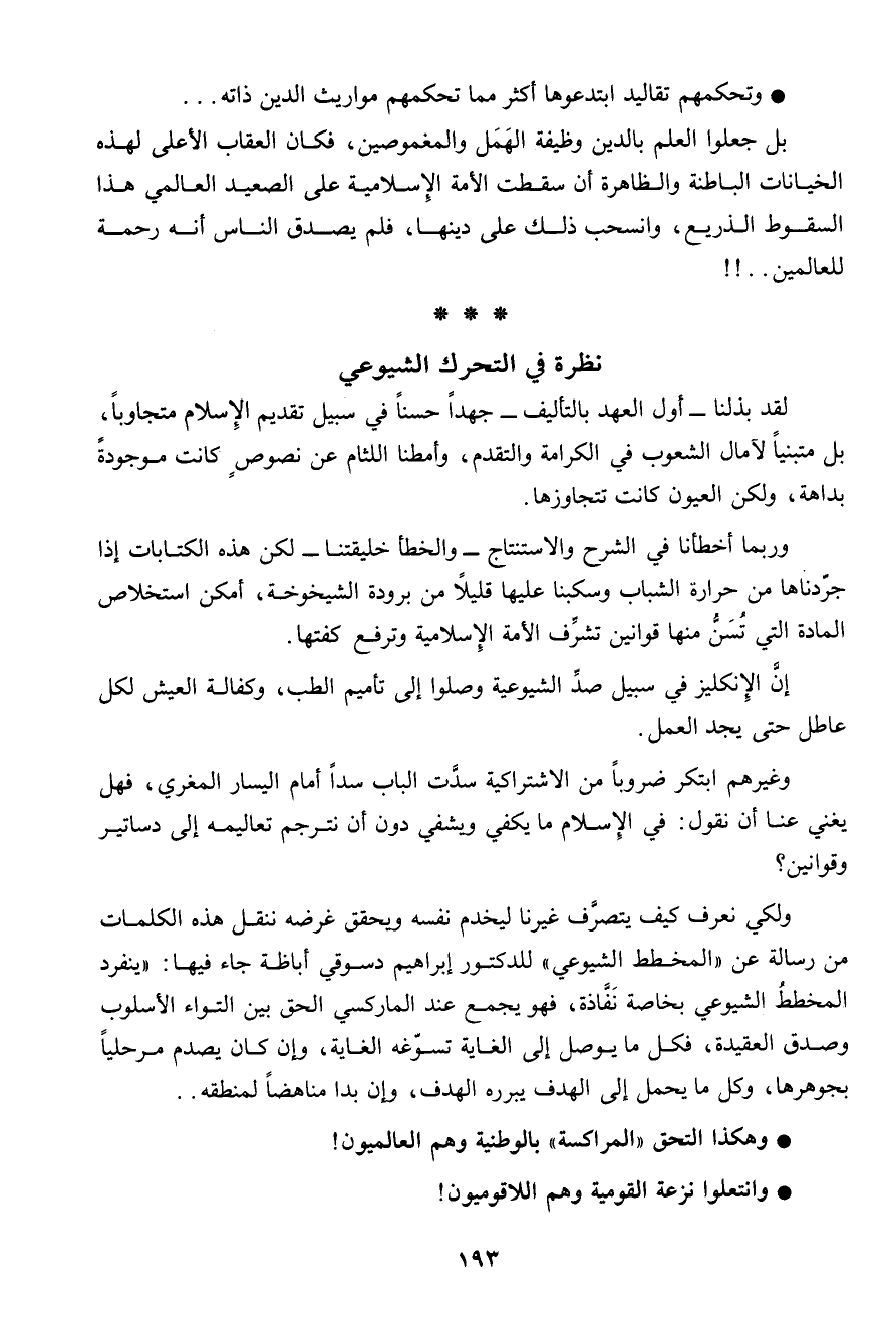 وغيرهم ابتكر ضروباً من الاشتراكية سدت الباب سداً أمام اليسار المغرى، فهل يغنى عنا أن نقول: فى الإسلام ما يكفى ويشفى دون أن نترجم تعاليمه إلى دساتير وقوانين؟