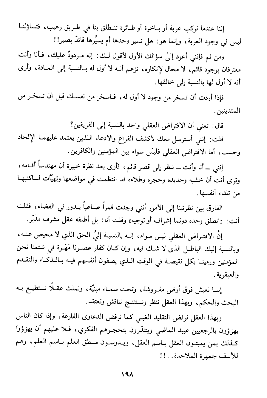 الفارق بين نظرتينا إلى الأمور أننى وجدت قمراً صناعياً يدور فى الفضاء، فقلت أنت: " انطلق وحده دونما إشراف أو توجيه " وقلت أنا: بل أطلقه عقل مشرف مدبر..