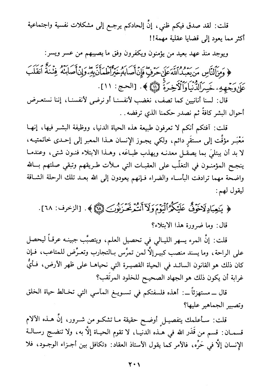 قال ـ مستهزئاً ـ: أهذه فلسفتكم فى تسويغ المآسى التى تخالط حياة الخلق وتصبير الجماهير عليها؟ قلت: سأعلمك ـ بتفصيل أوضح ـ حقيقة ما تشكو من شرور، إن هذه الآلام قسمان: قسم من قدر الله فى هذه الدنيا، لا تقوم الحياة إلا به، ولا تنضج رسالة الإنسان إلا فى حره، فالأمر كما يقول الأستاذ العقاد: " تكافل بين أجزاء الوجود، فلا