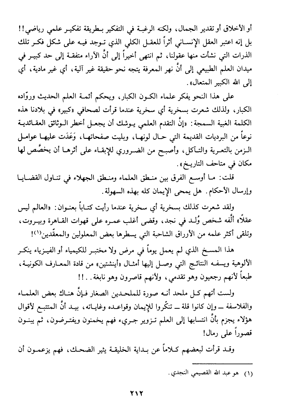 ولقد شعرت كذلك بسخرية أى سخرية عندما رأيت كتاباً بعنوان " العالم ليس عقلاً " ألفه شخص ولد فى نجد وقضى أغلب عمره على قهوات القاهرة وبيروت، وتلقى أكثر علمه من الأوراق الشاحبة التى يسطرها بعض المعلولين والمعقدين!