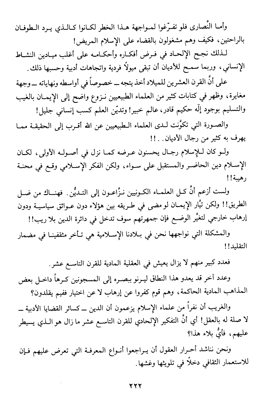 والغريب أن نفراً من علماء الإسلام يزعمون أن الدين ـ كسائر القضايا الأدبية ـ لا صلة له بالعقل! أى أن التفكير الإلحادى للقرن التاسع عشر ما زال هو الذى يسيطر عليهم، فأى بلاء هذا؟