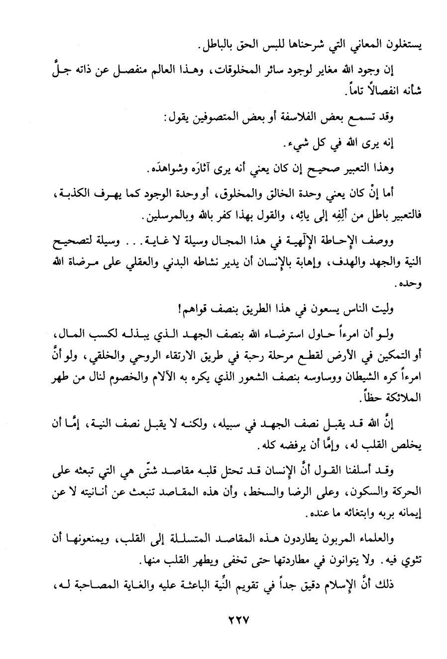 ولو أن امرءاً حاول استرضاء الله بنصف الجهد الذى يبذله لكسب المال، أو التمكين فى الأرض لقطع مرحلة رحبة فى طريق الارتقاء الروحى والخلقى، ولو أن امرءاً كره الشيطان ووساوسه بنصف الشعور الذى يكره به الآلام والخصوم لنال من طهر الملائكة حظاً.