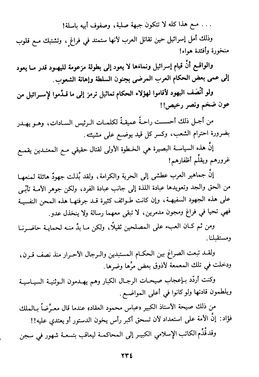 إن جماهير العرب عطشى إلى الحرية والكرامة، ولقد بذلت جهود هائلة لمنعها من الحق والجد وتعويدها عبادة اللذة إلى جانب عبادة الفرد، ولكن جوهر الأمة تأبى على هذه الجهود السفيهة، وإن كانت طوائف كثيرة قد جرفتها هذه المحن النفسية فهى تحيا فى فراغ ومجون مدمرين، لا تبقى معهما رسالة ولا ينخذل عدو..