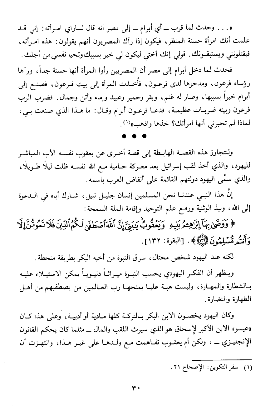 ".. وحدث لما قرب ـ أى ابرام ـ إلى مصر أنه قال لساراى امرأته: إنى قد علمت أنك امرأة حسنة المنظر، فيكون إذا رآك المصروين أنهم يقولون: هذه امرأته، فيقتلوننى ويستبقونك، قولى إنك أختى ليكون لى خير بسببك وتحيا نفسى من أجلك. فحدث لما دخل أبرام إلى مصر أن المصريين رأوا المرأة أنها حسنة جداً، ورآها رؤساء فرعون، ومدحوها لدى فرعون، فأخذت المرأة إلى بيت فرعون، فصنع إلى ابرام خيراً بسببها، وصار له غنم، وبقر وحمير وعبيد وإماء وأتن وجمال، فضرب الرب فرعون وبيته ضربات عظيمة.. فدعا فرعون ابرام وقال: ما هذا الذى صنعت بى، لماذا لم تخبرنى أنها امرأتك؟ خذها واذهب " (تكوين: 21)