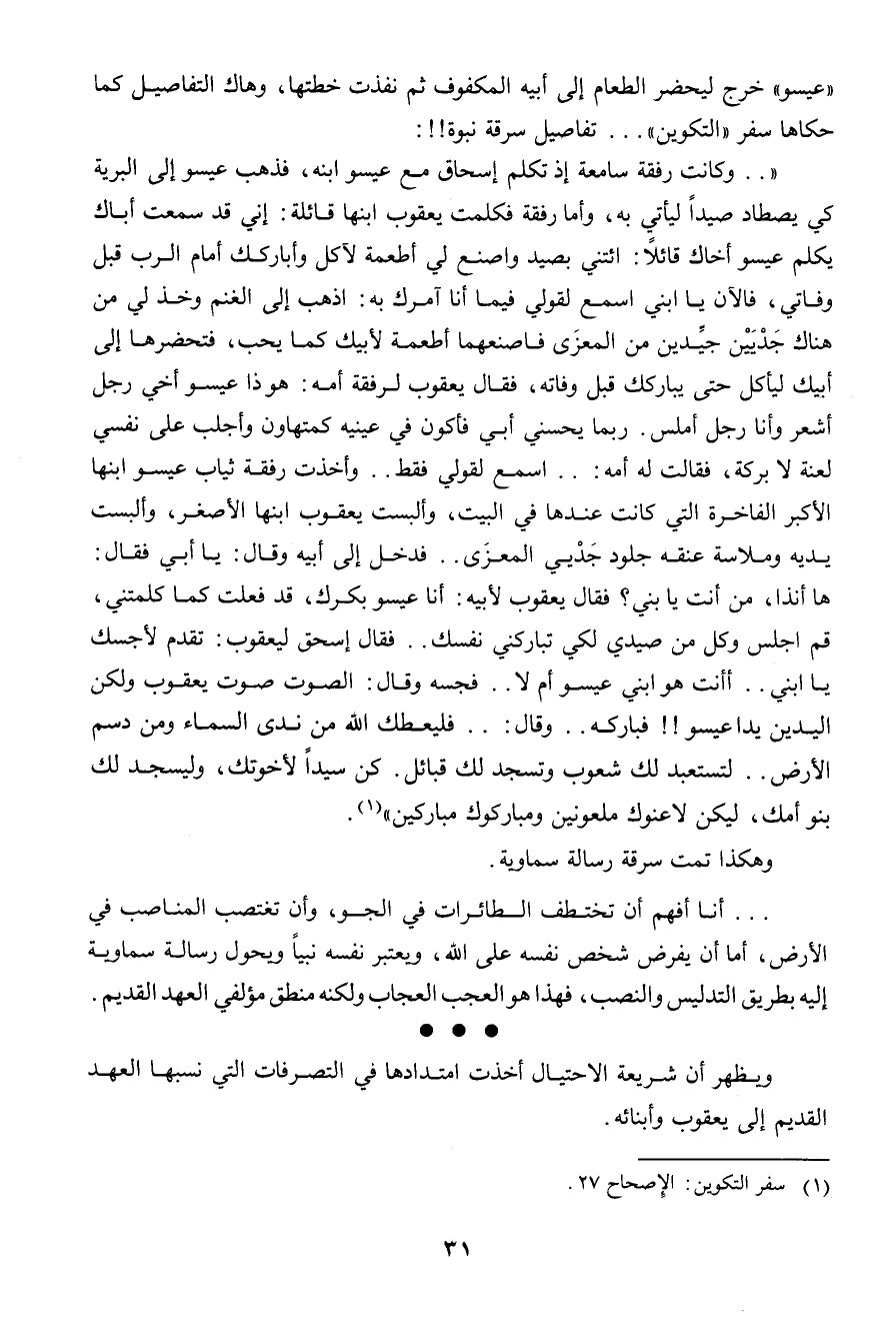 .. أنا أفهم أن تختطف الطائرات فى الجو، وأن تغتصب المناصب فى الأرض، أما أن يفرض شخص نفسه على الله، ويعتبر نفسه نبياً، ويحول رسالة سماوية إليه بطريق التدليس والنصب، فهذا هو العجب العجاب، ولكنه منطق مؤلفى العهد القديم.
