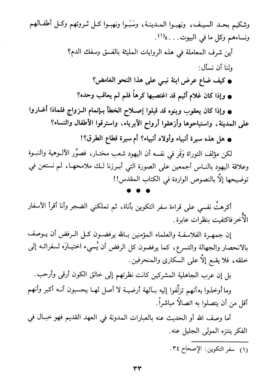 أكرهت نفسى على قراءة سفر التكوين بأناة، ثم تملكنى الضجر وأنا أقرأ الأسفار الأُخَر فاكتفيت بنظرات عابرة.