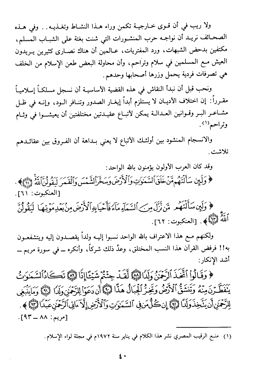 ونحب قبل أن نبدأ النقاش فى هذه القضية الأساسية أن نسجل مسلكاً إسلامياً مقرراً: إن اختلاف الأديان لا يستلزم أبداً إيغار الصدور وتنافر الود، وأنه فى ظل مشاعر البر وقوانين العدالة يمكن لأتباع عقيدتين مختلفتين أن يعيشوا فى وئام وتراحم!!